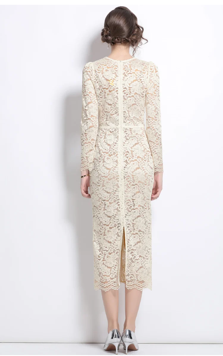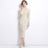 ZJYT Runway 2025 Women’s Spring Beading Hollow Out Lace Dresses Elegant Long Sleeve V Neck Midi Party Dress Female Vestidos