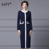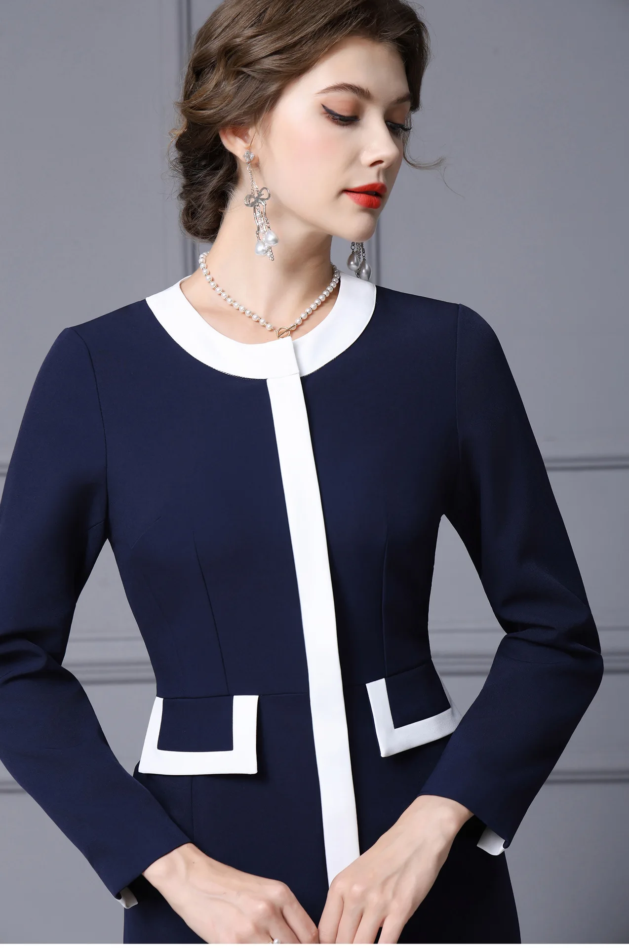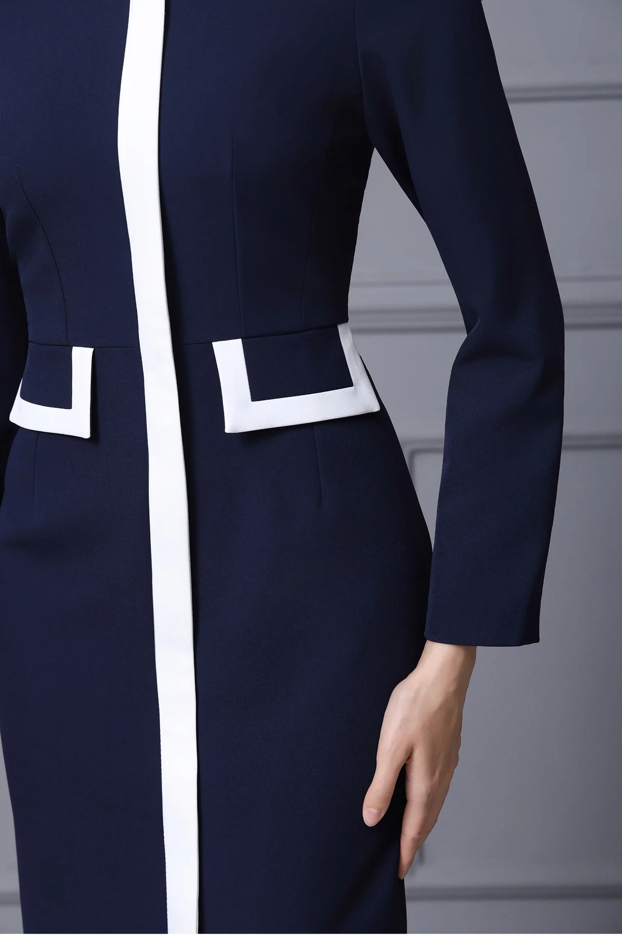 ZJYT Runway Fashion Autumn Color Block White and Blue Office Dress Women Elegant Long Sleeve Brief Midi Straight Dresses Vestido
