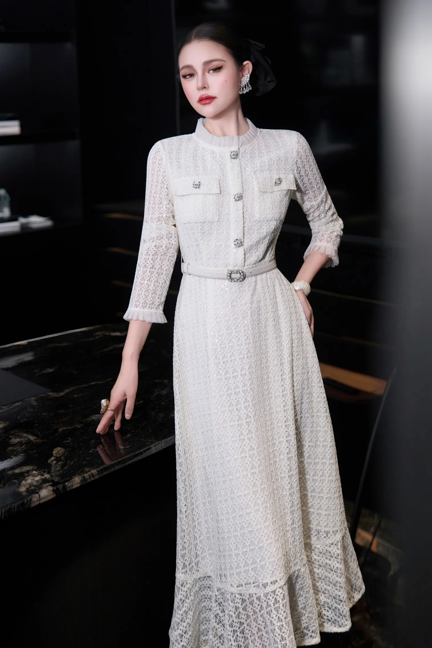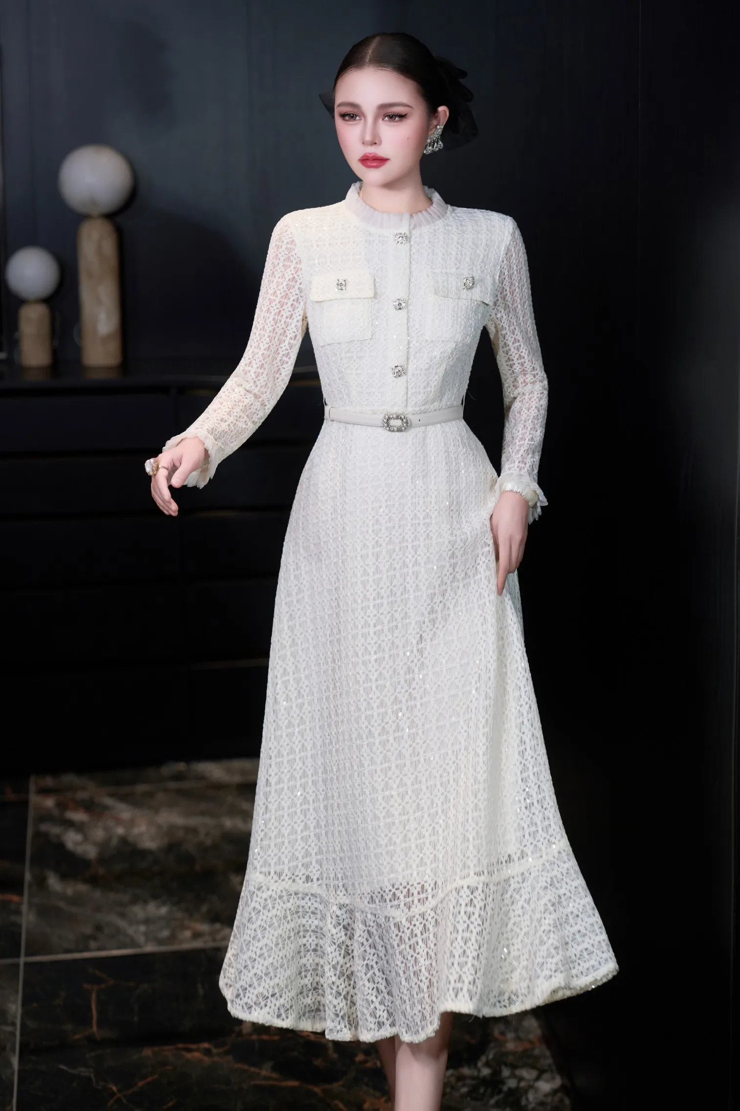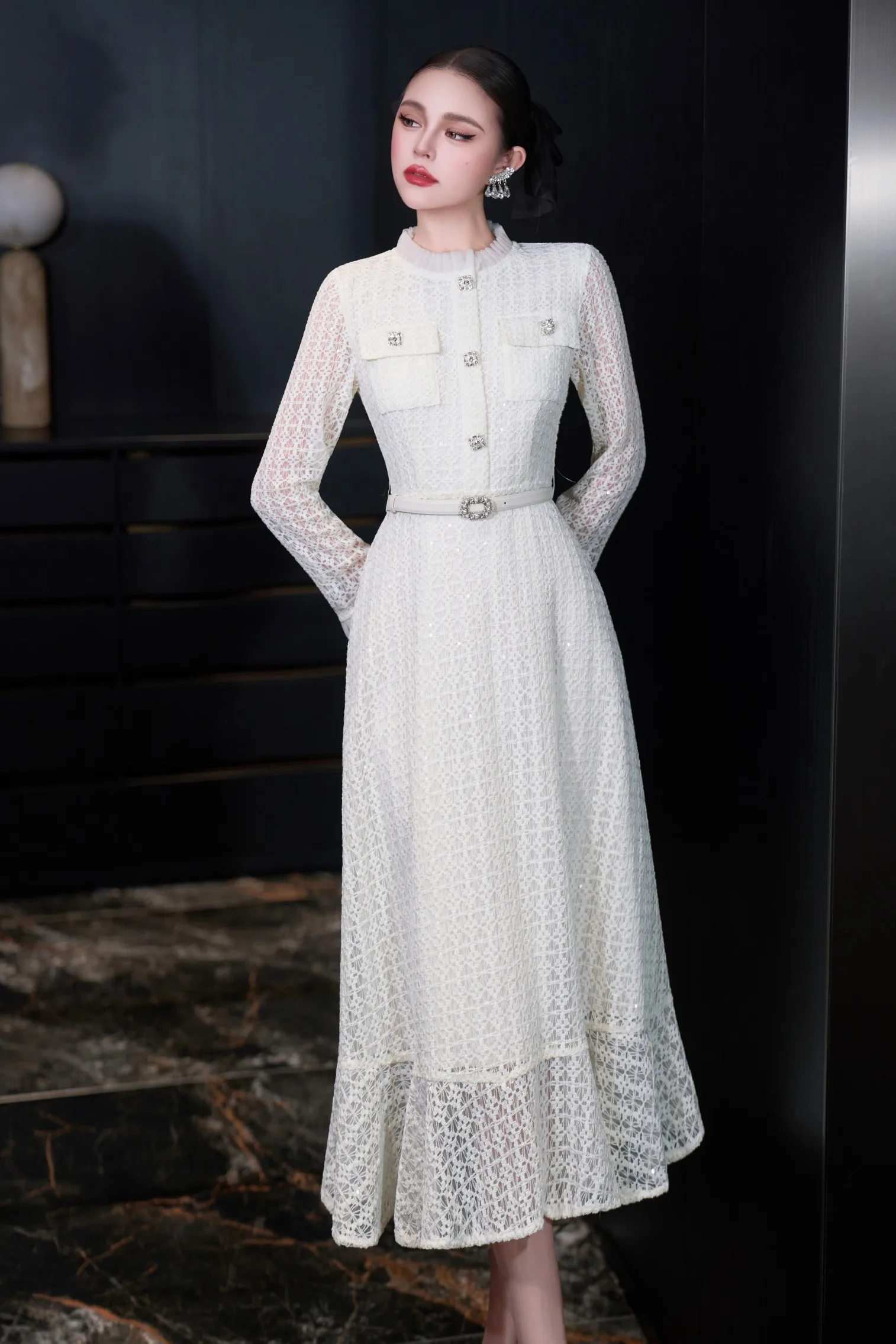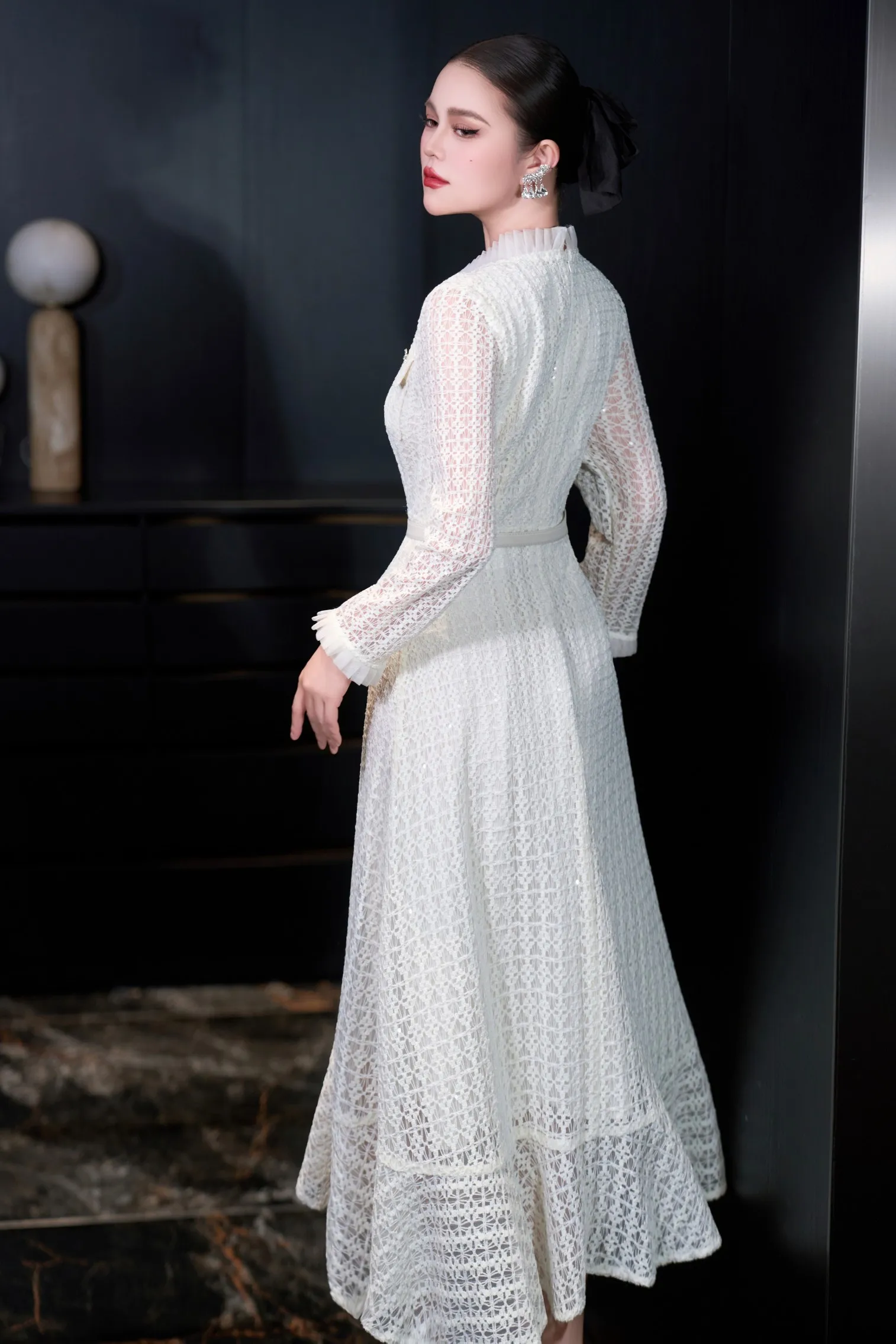 ZJYT Runway Fashion Women’s Sequined Lace Dresses Autumn 2025 New Designer Long Sleeve Elegant Midi Party Evening Dress White