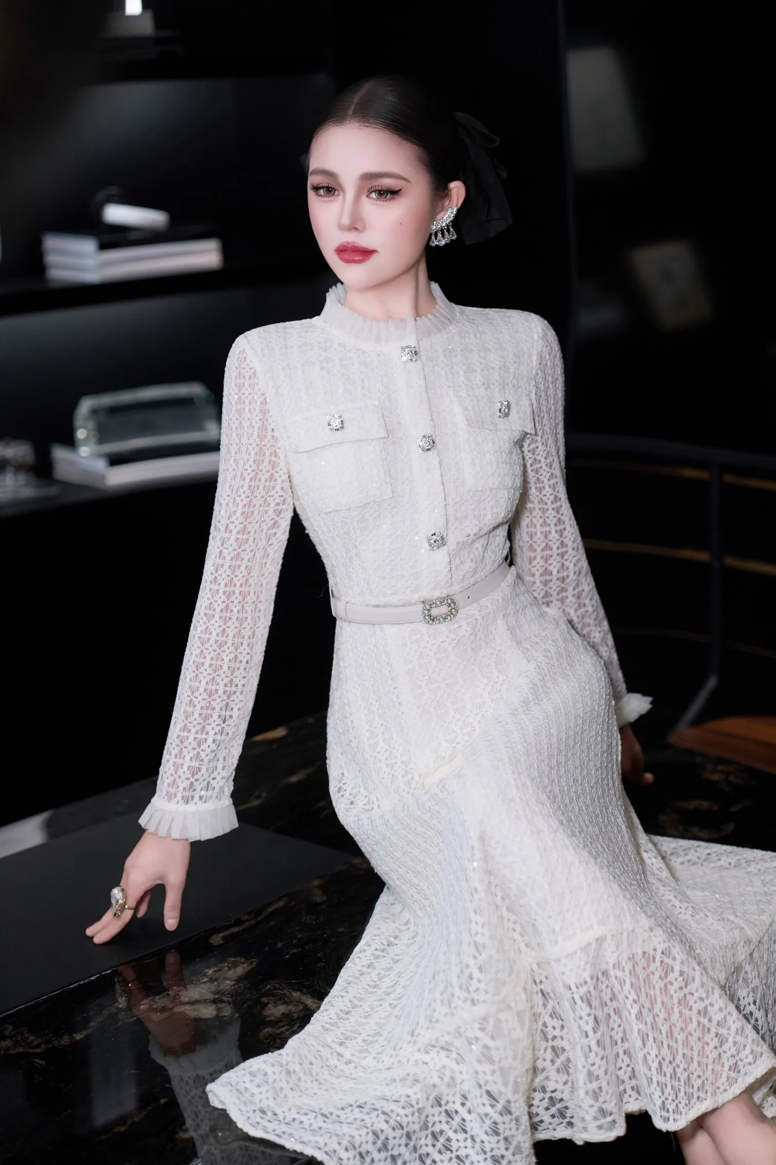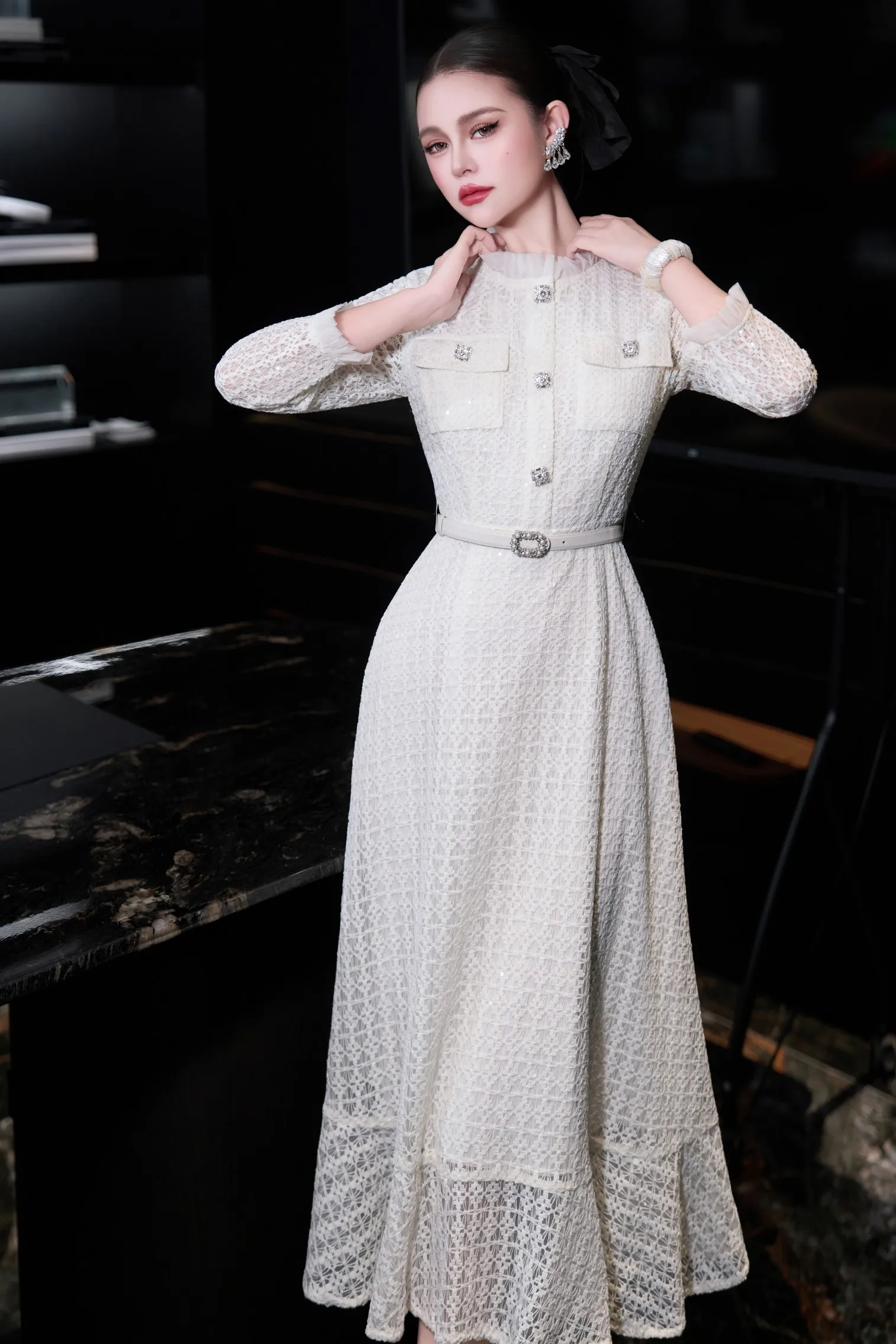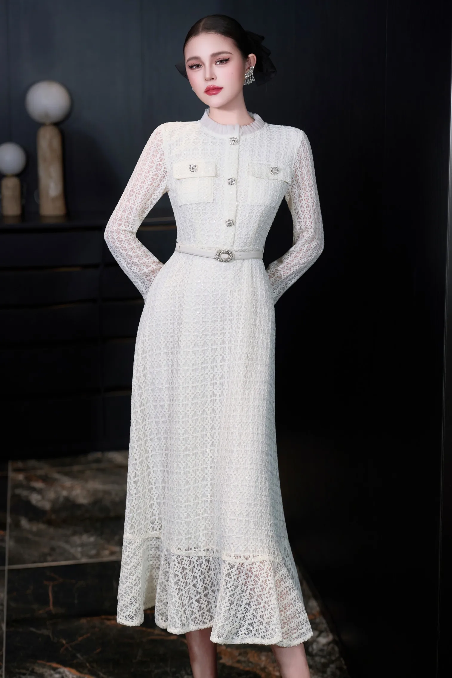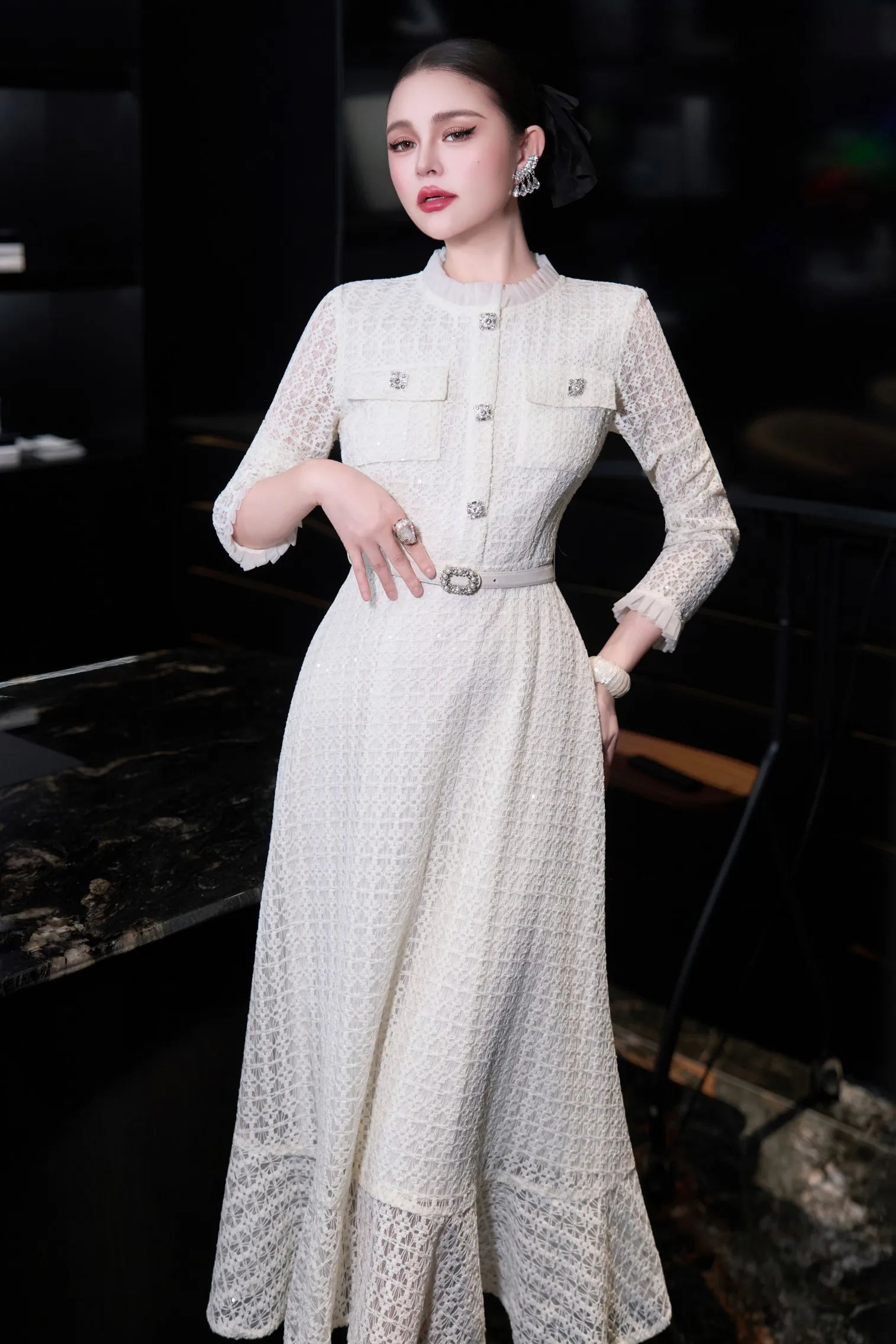 ZJYT Runway Fashion Women’s Sequined Lace Dresses Autumn 2025 New Designer Long Sleeve Elegant Midi Party Evening Dress White