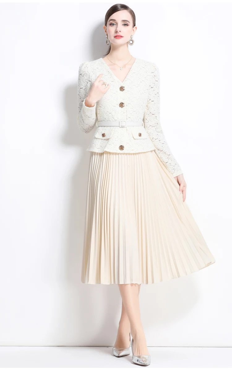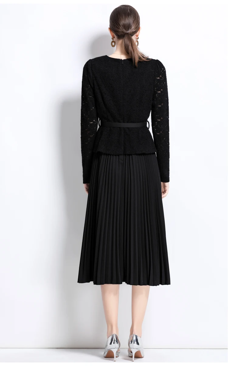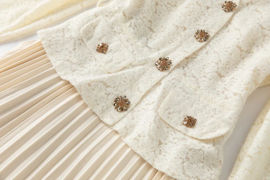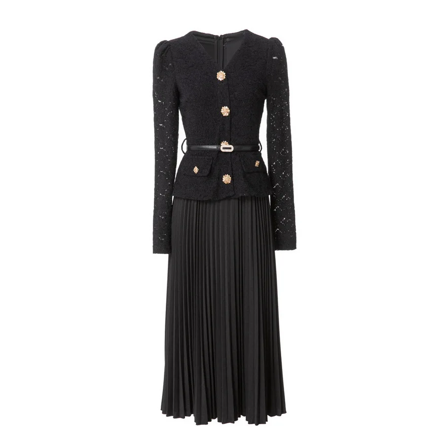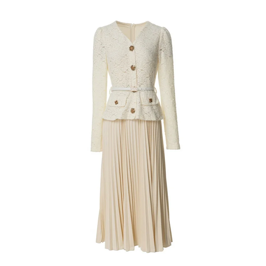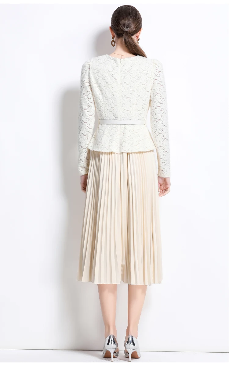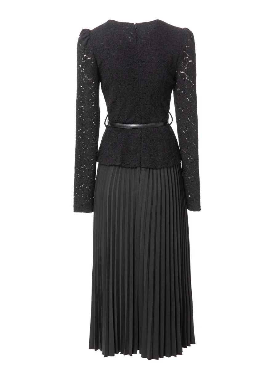 ZJYT Runway Fashion Womens Spring Dresses 2025 New Long Sleeve Lace Patchwork Midi Pleated Dress Elegant Vestidos Clothes Female