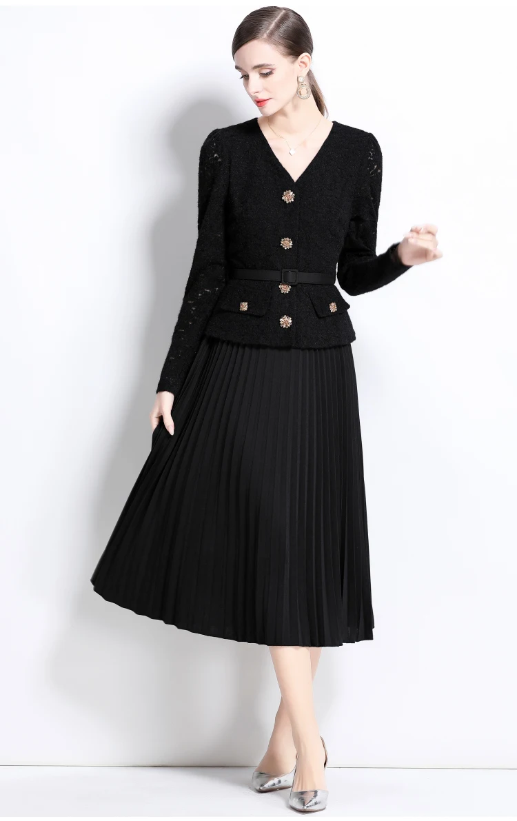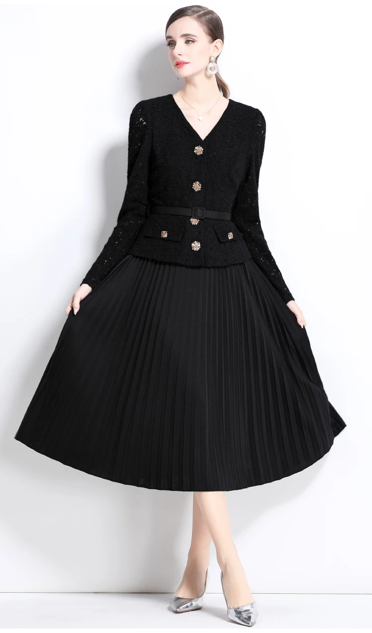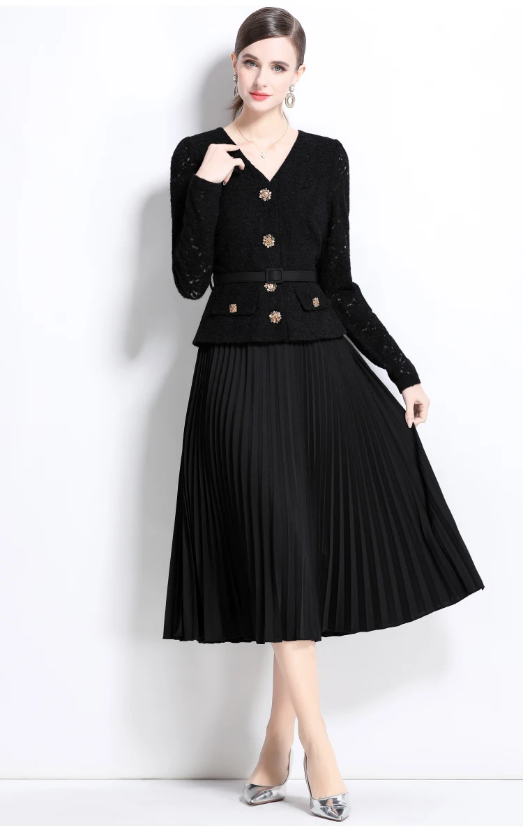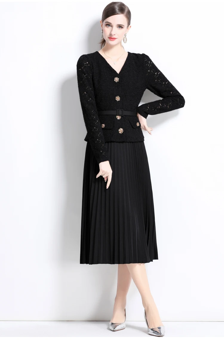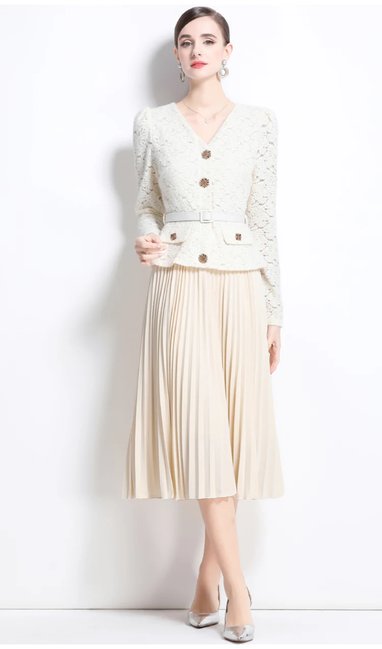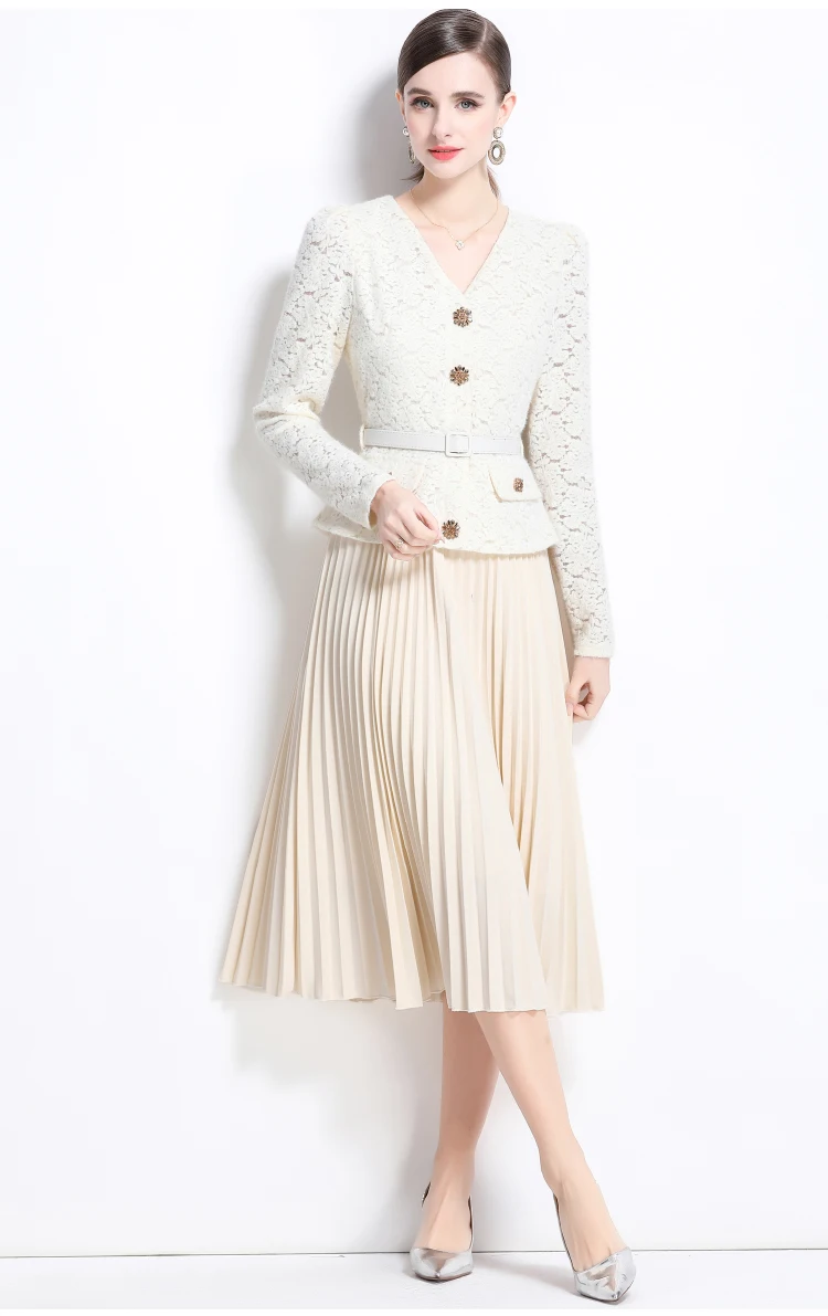 ZJYT Runway Fashion Womens Spring Dresses 2025 New Long Sleeve Lace Patchwork Midi Pleated Dress Elegant Vestidos Clothes Female