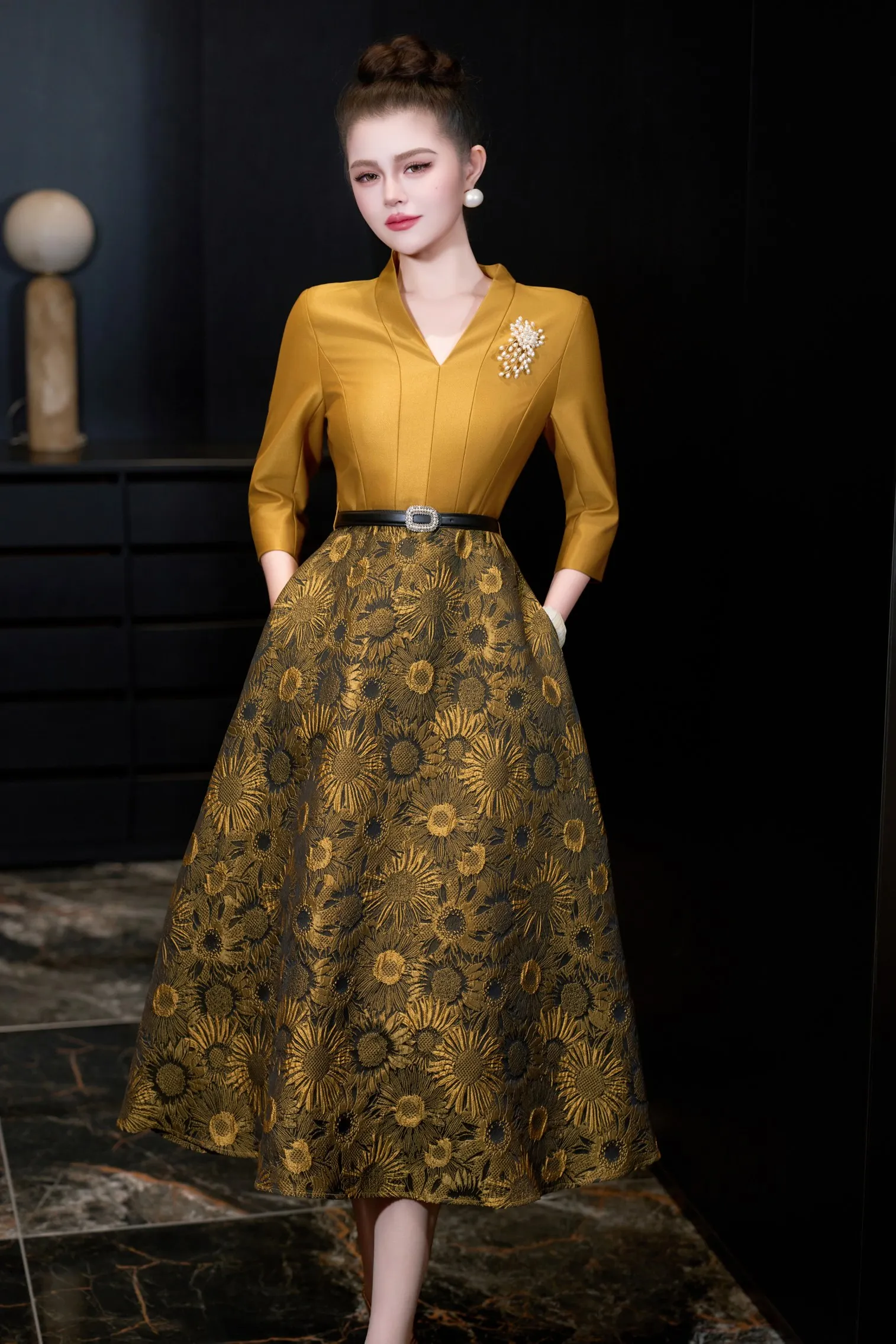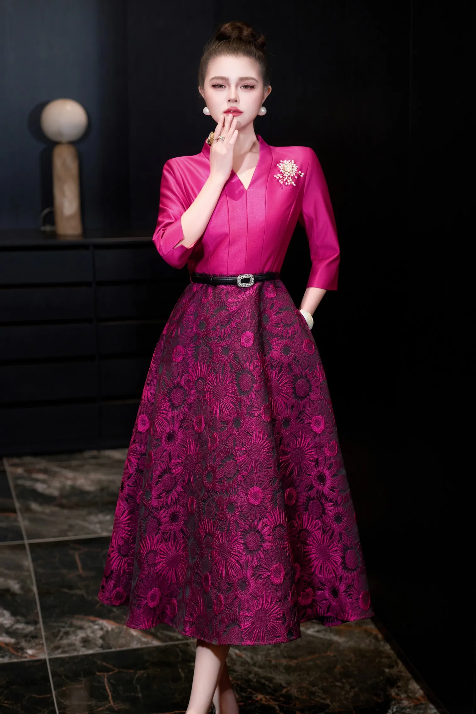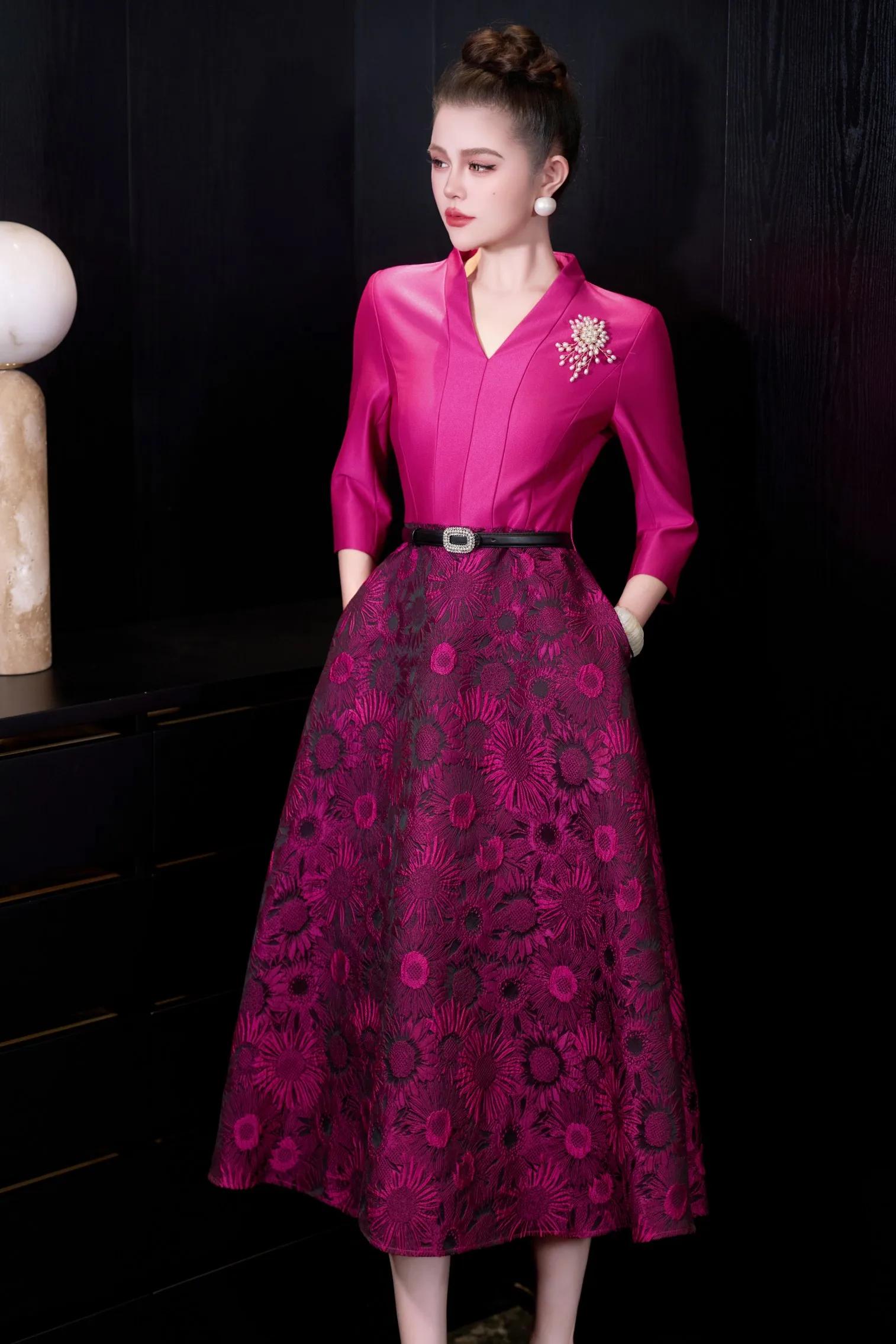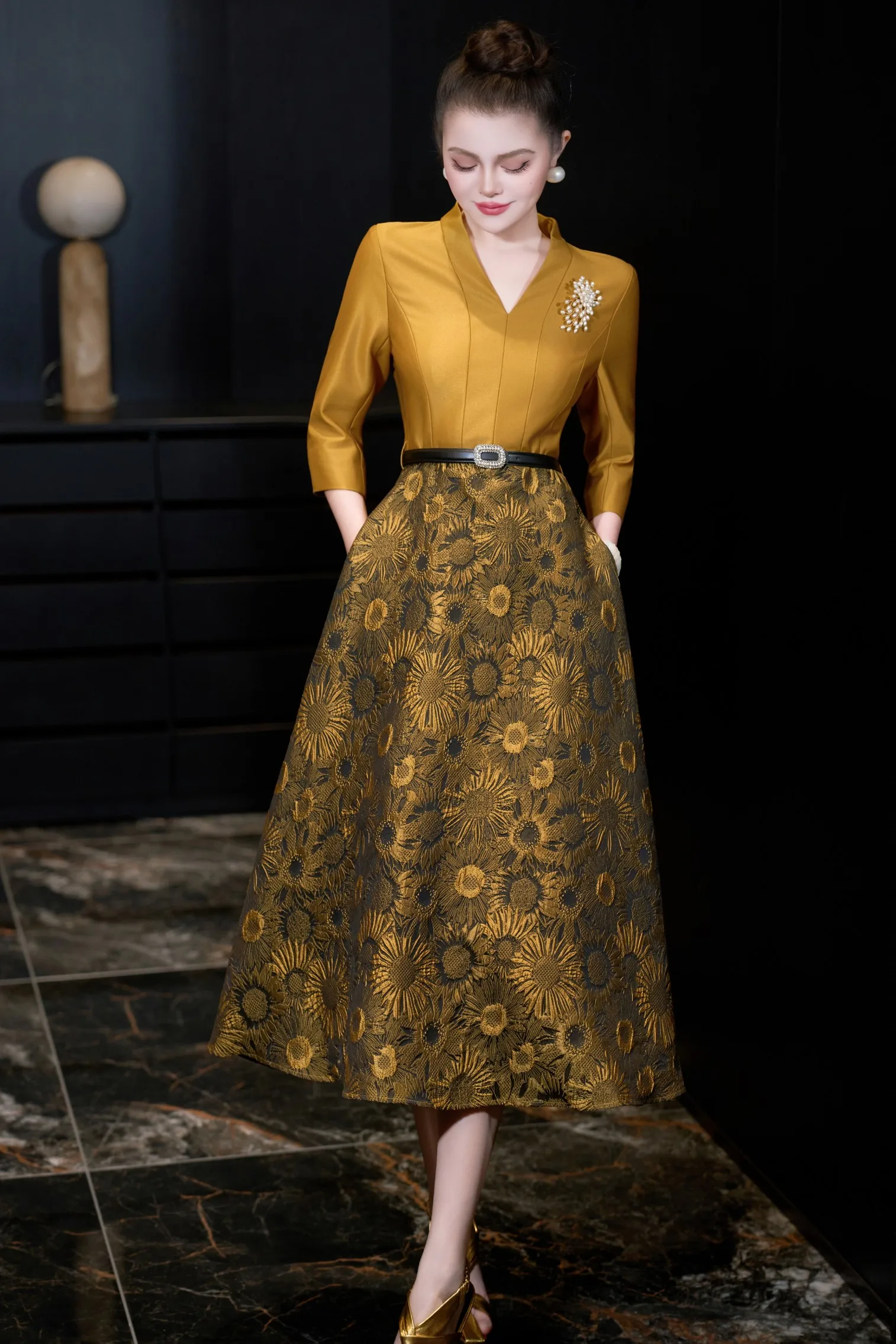 ZJYT Spring New 2026 Elegant Midi Vintage Jacquard Dresses for Women Three Quarter Sleeves V Neck Luxury Party Dress Female Robe