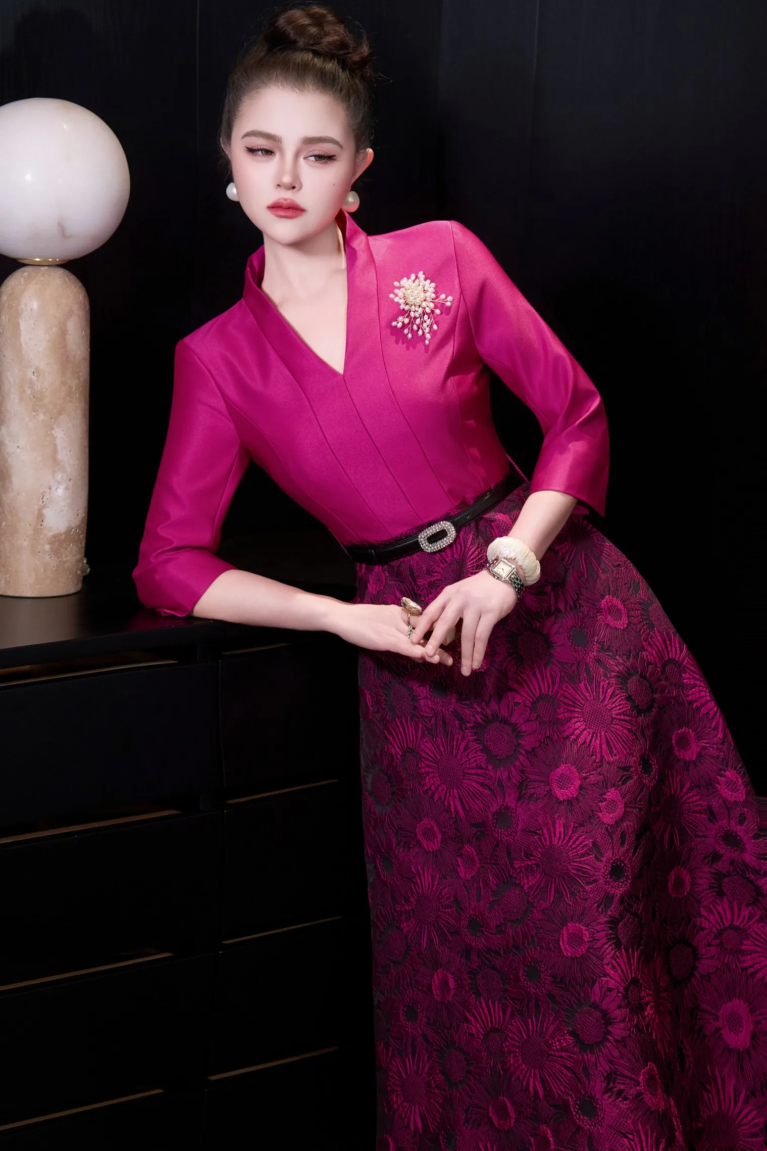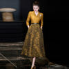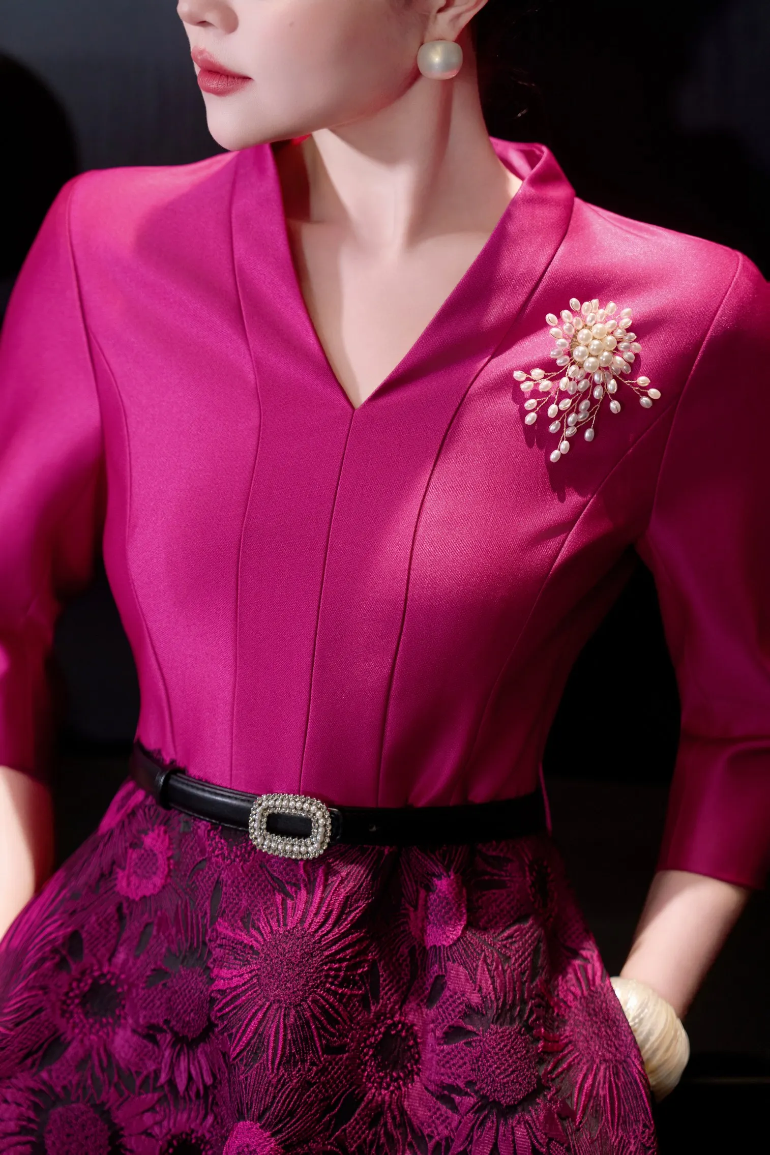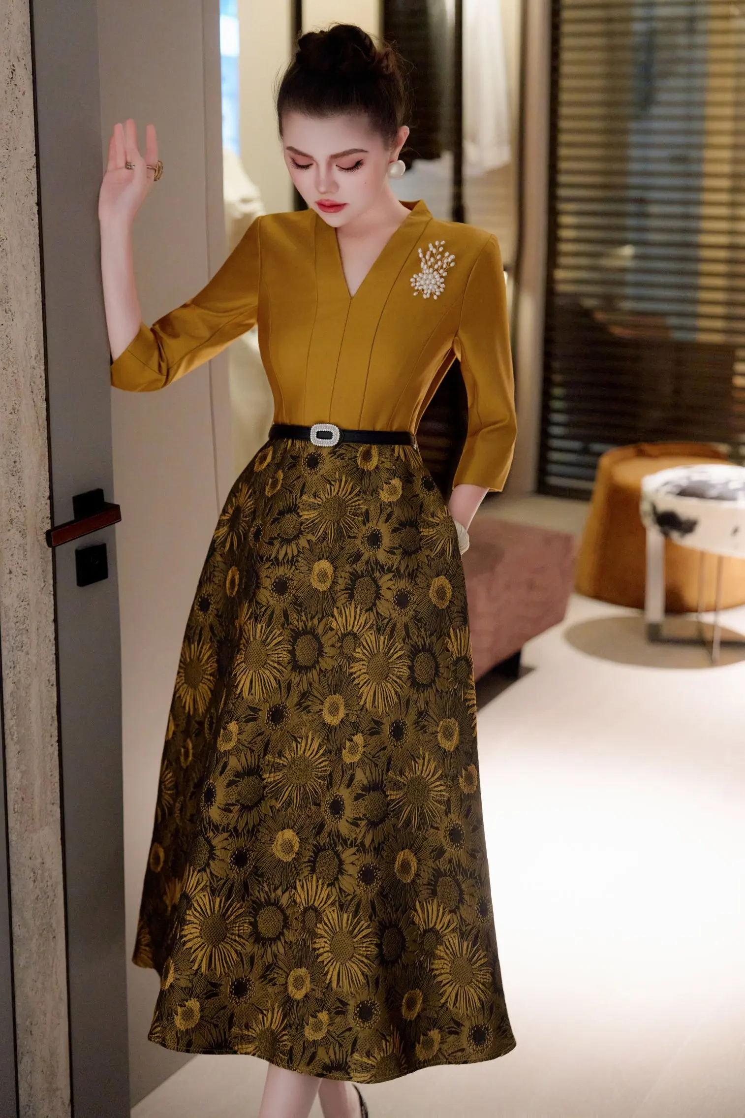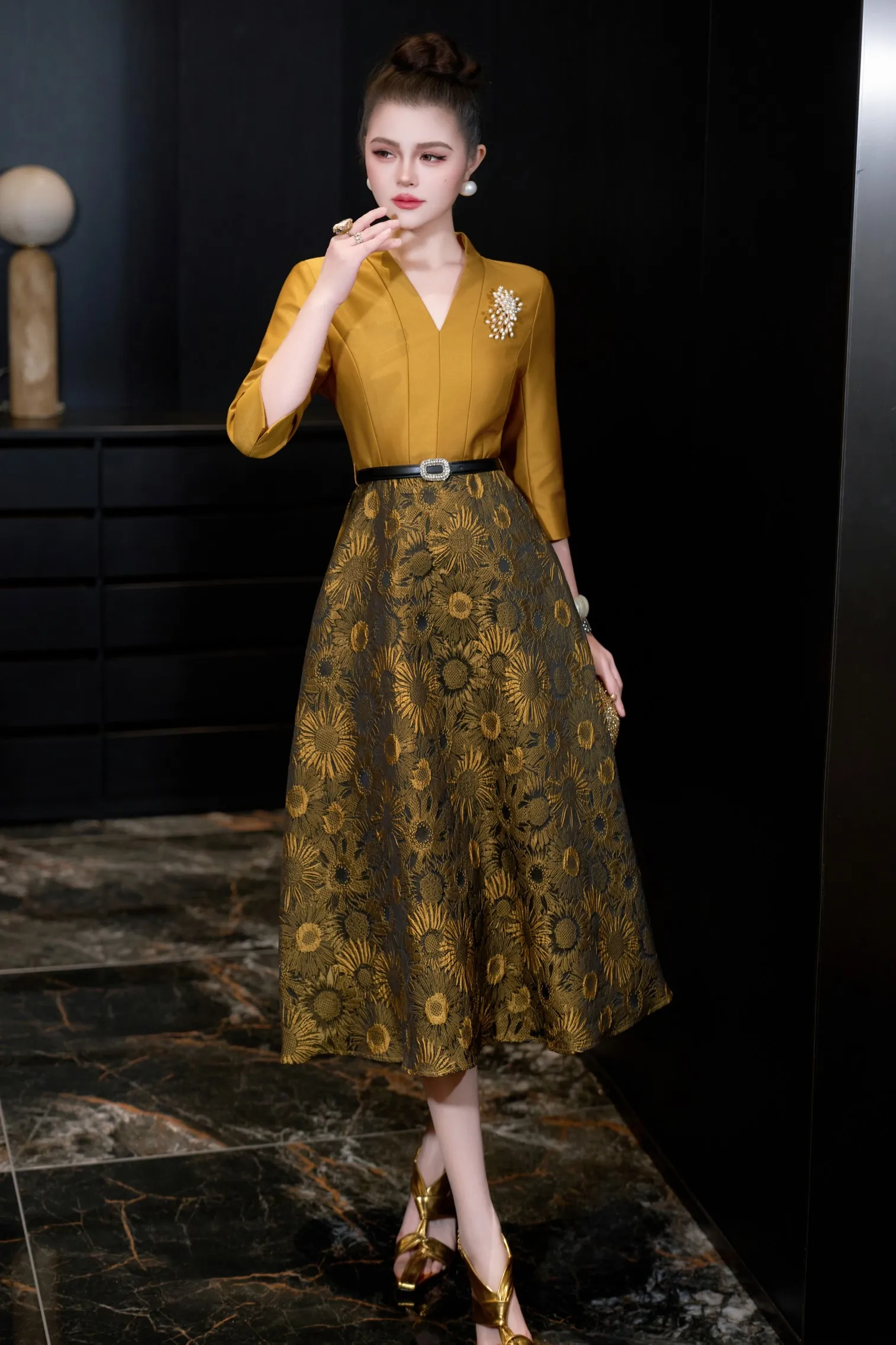 ZJYT Spring New 2026 Elegant Midi Vintage Jacquard Dresses for Women Three Quarter Sleeves V Neck Luxury Party Dress Female Robe