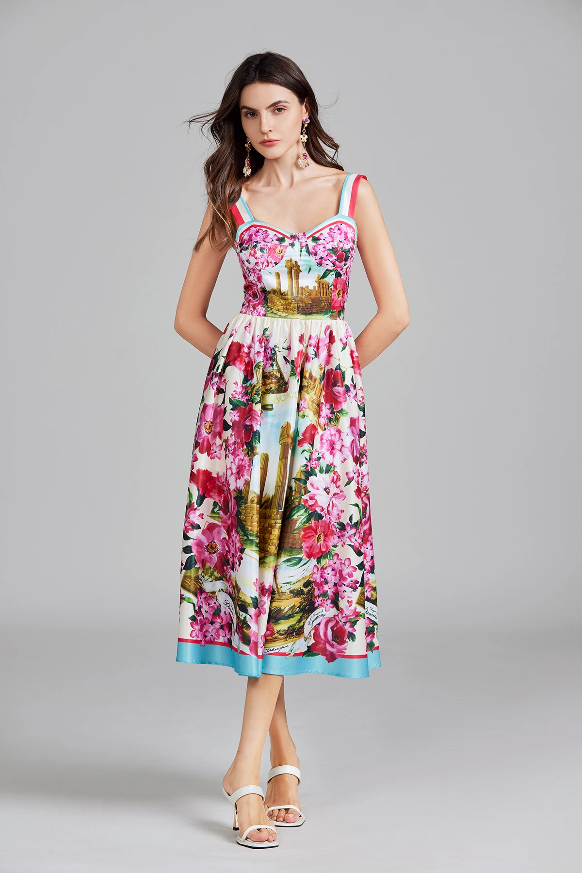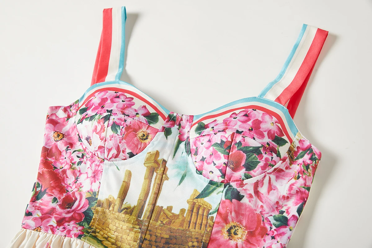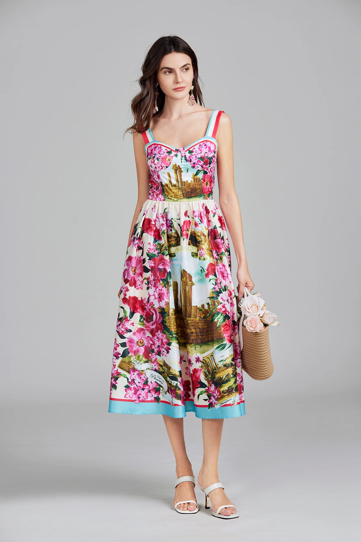 ZJYT Summer Runway 2025 Fashion Womens Floral Print Sleeveless Dress Spaghetti Strap Backless Holiday Beach Midi Dresses Sexy