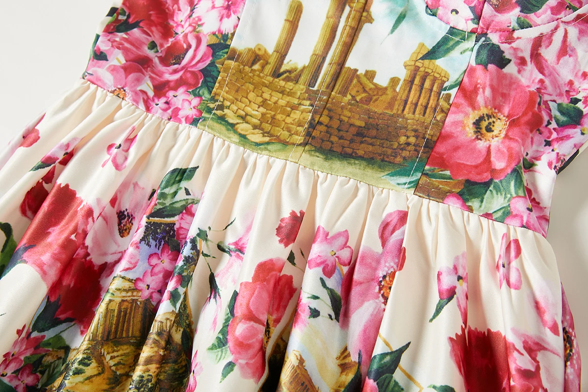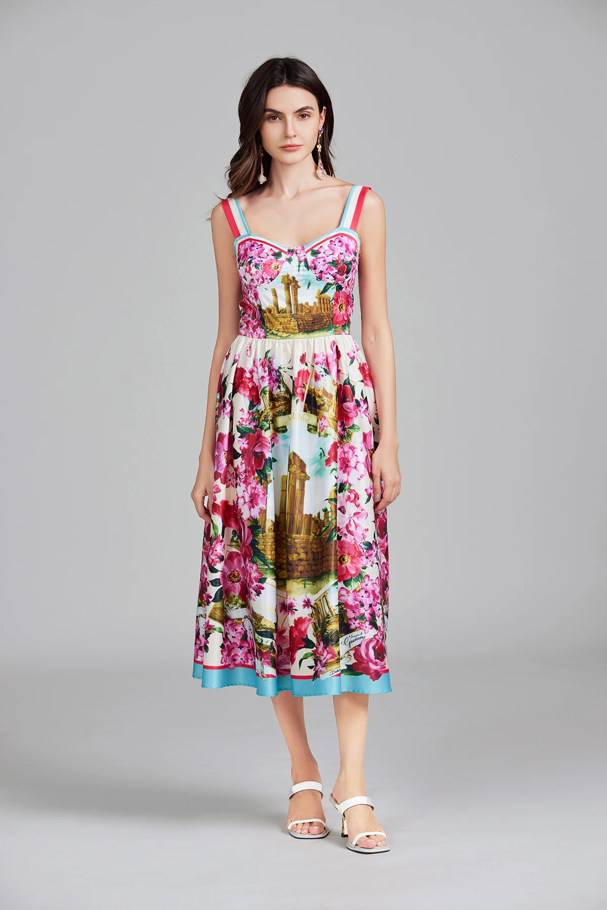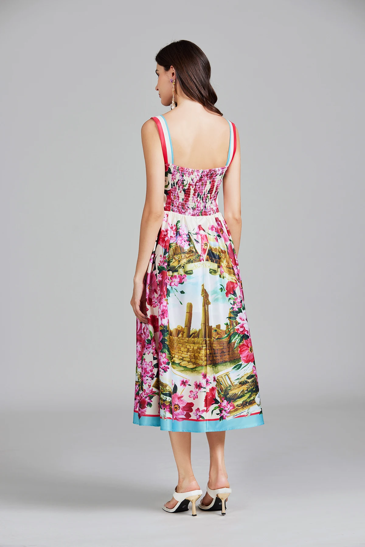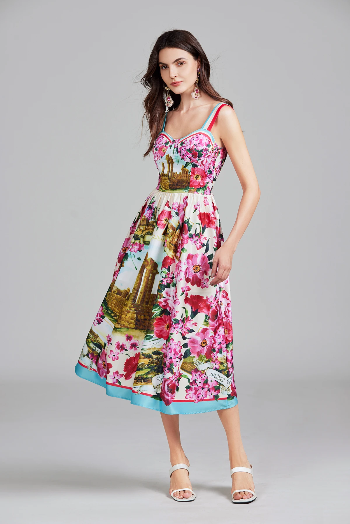 ZJYT Summer Runway 2025 Fashion Womens Floral Print Sleeveless Dress Spaghetti Strap Backless Holiday Beach Midi Dresses Sexy