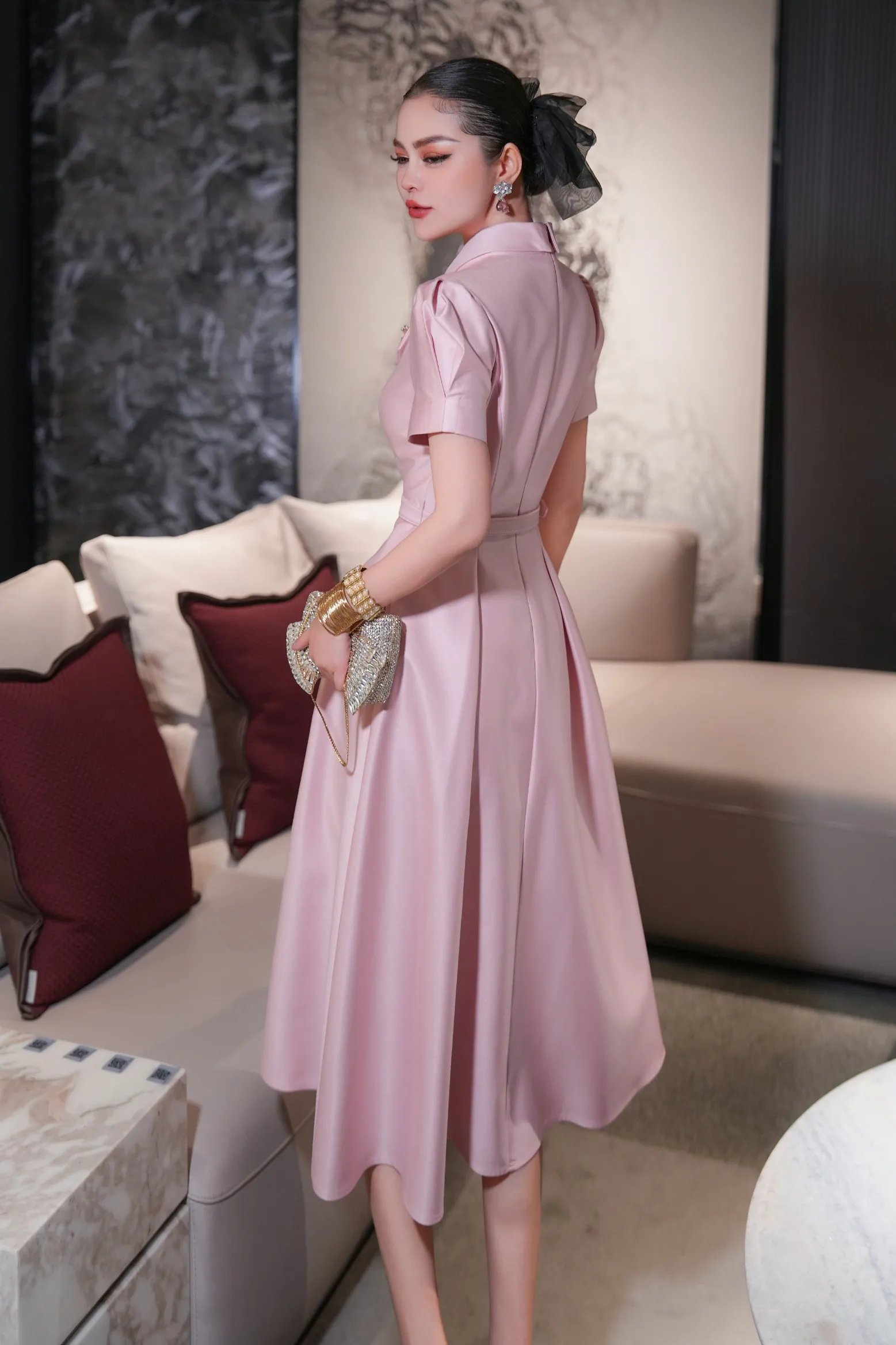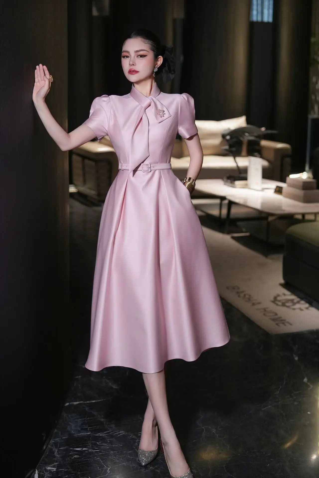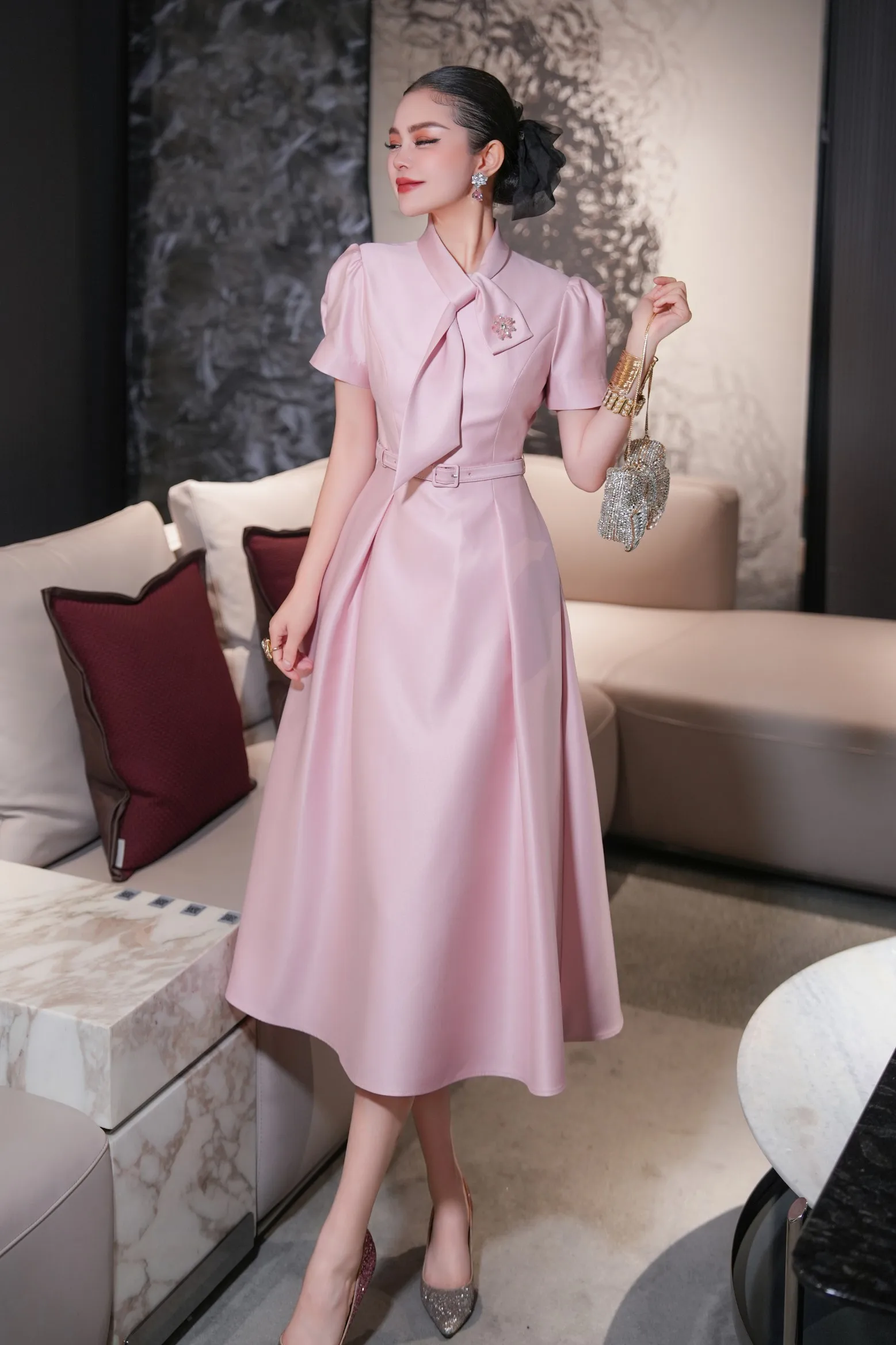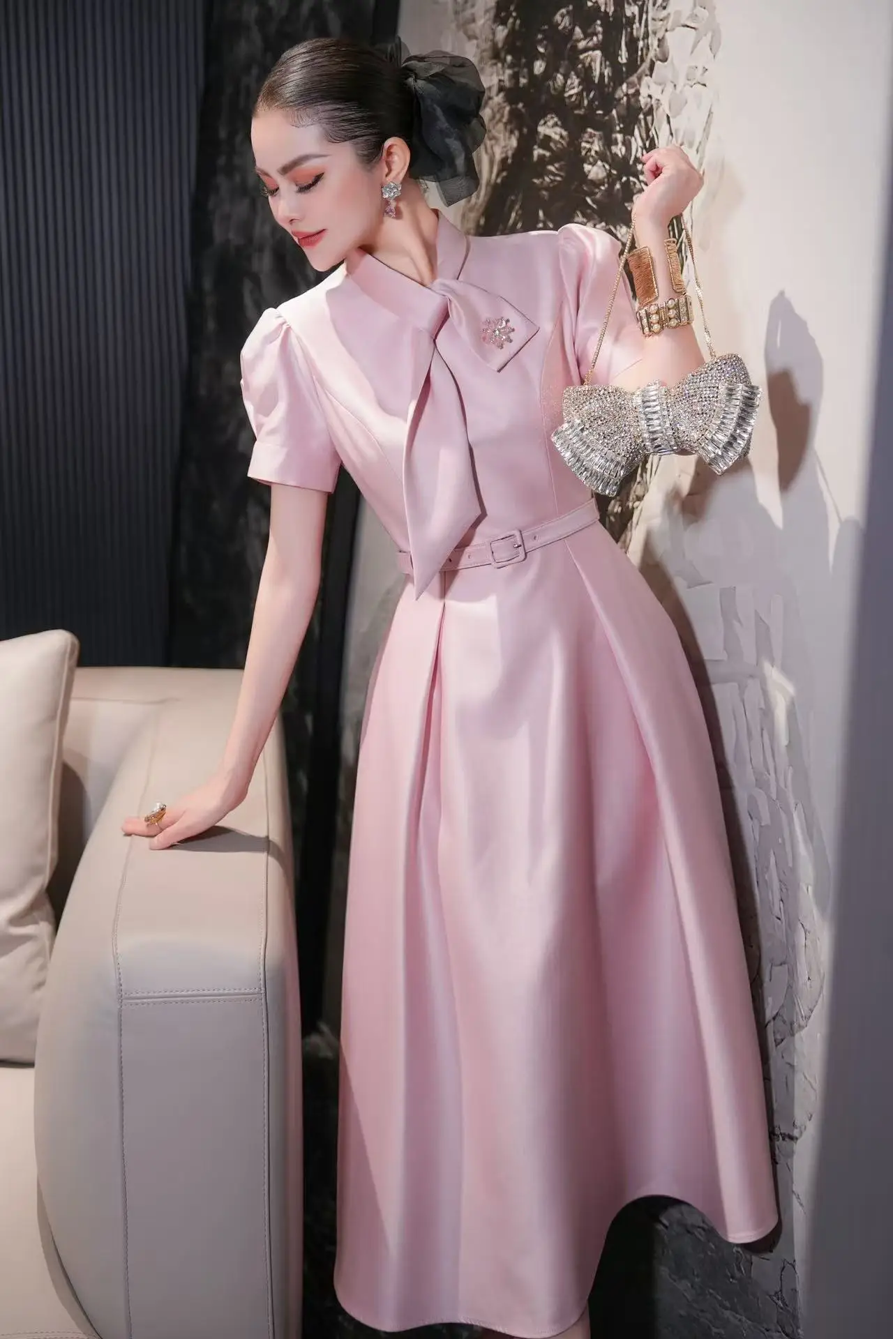 ZJYT Sweet Pink Bow Collar Dress for Women Short Sleeve Midi Formal Party Aline Vestidos Elegant Spring Summer Designer 2025 New