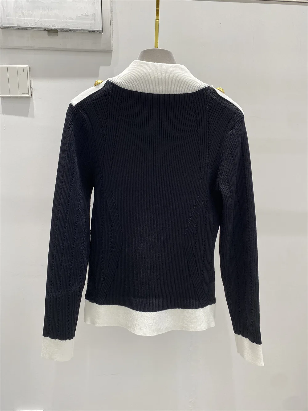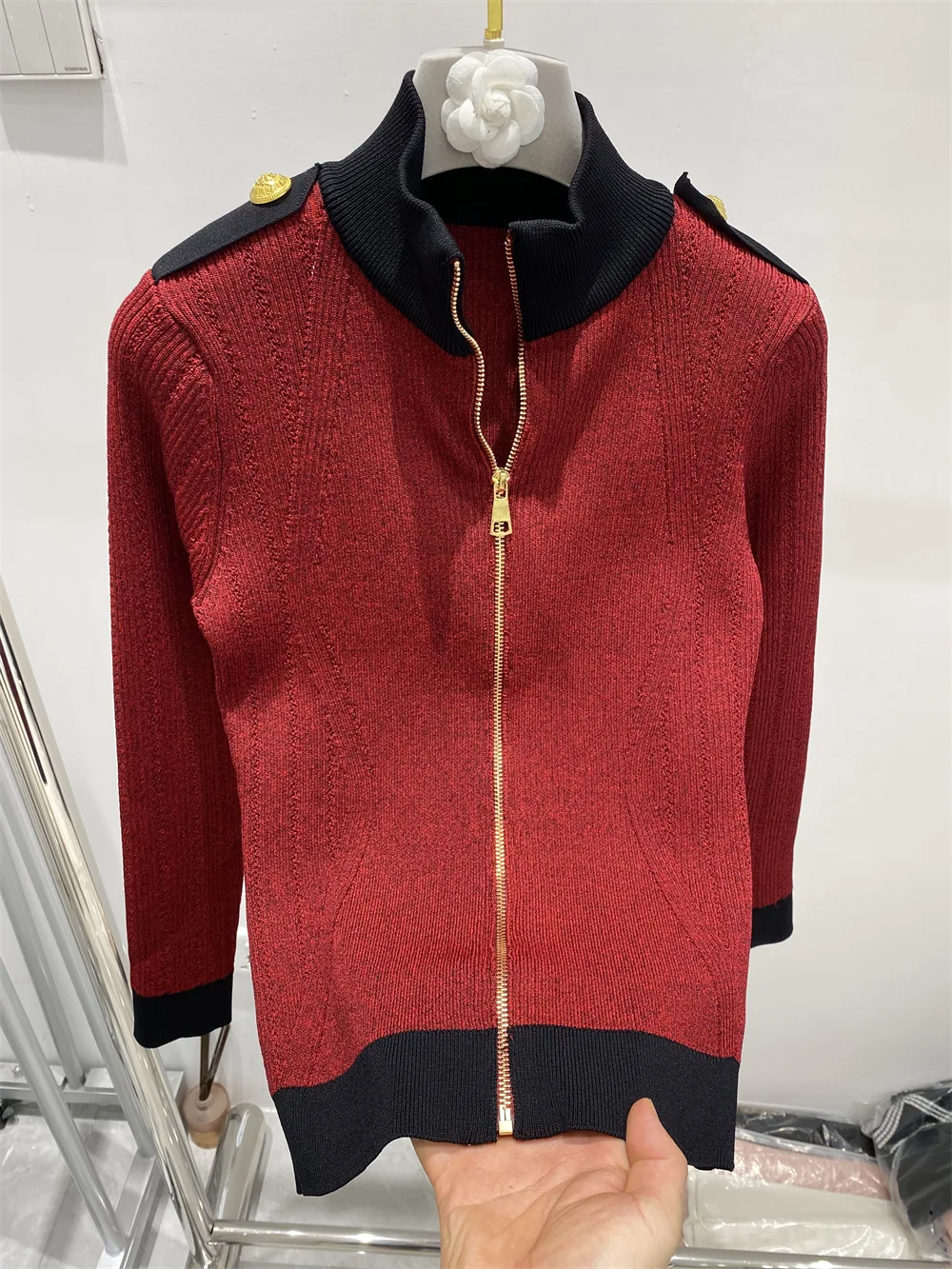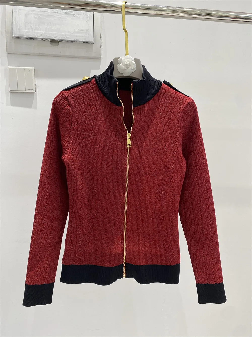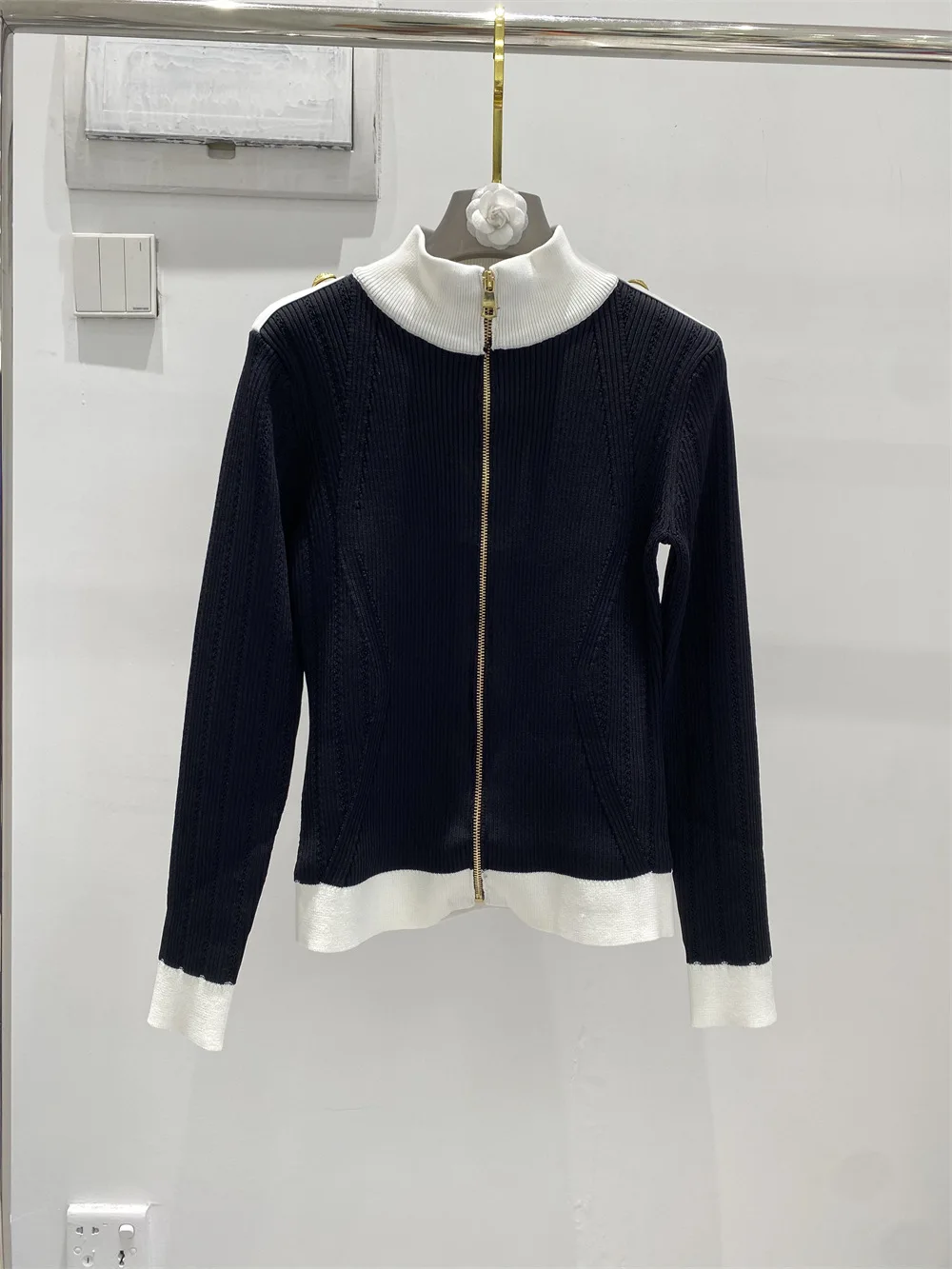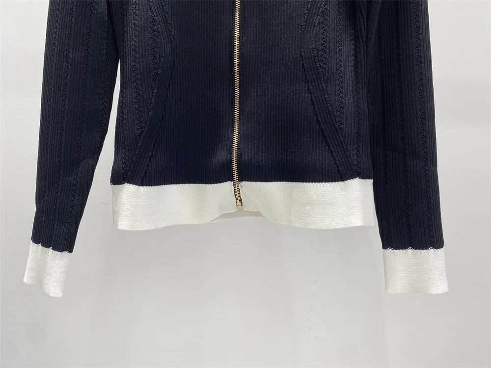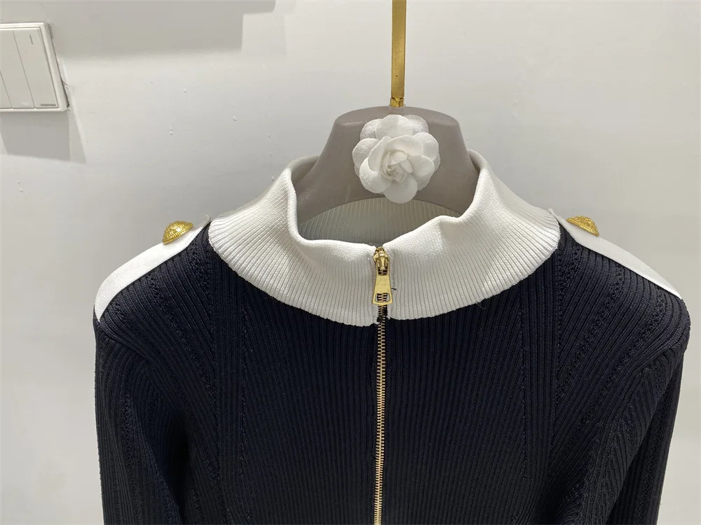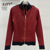 ZJYT Women Fashion Autumn Winter Knitted Sweaters Zipper Stand Collar Cardigans Coat Long Sleeve Color Block Knitwears Tops