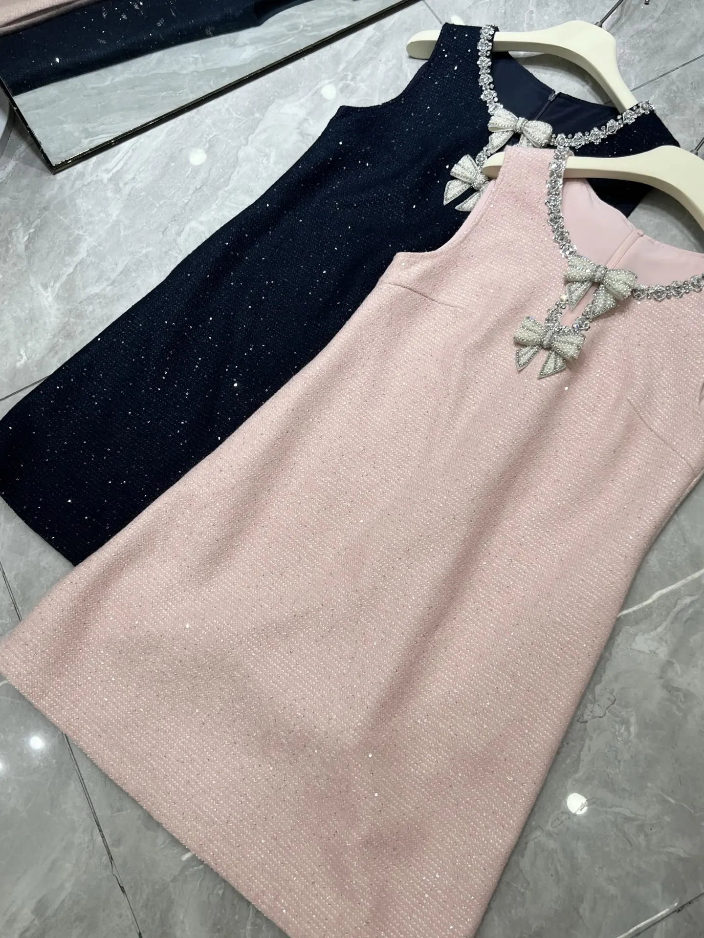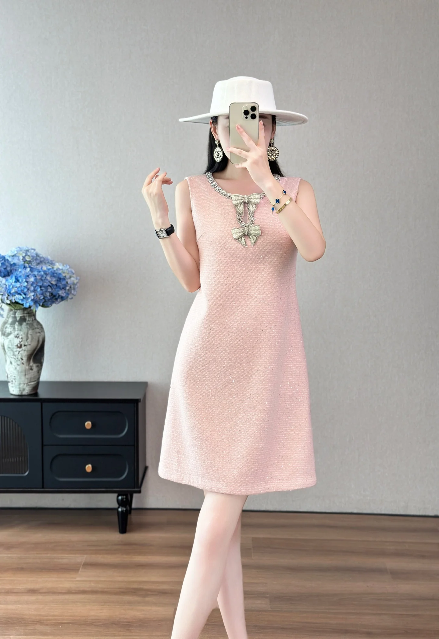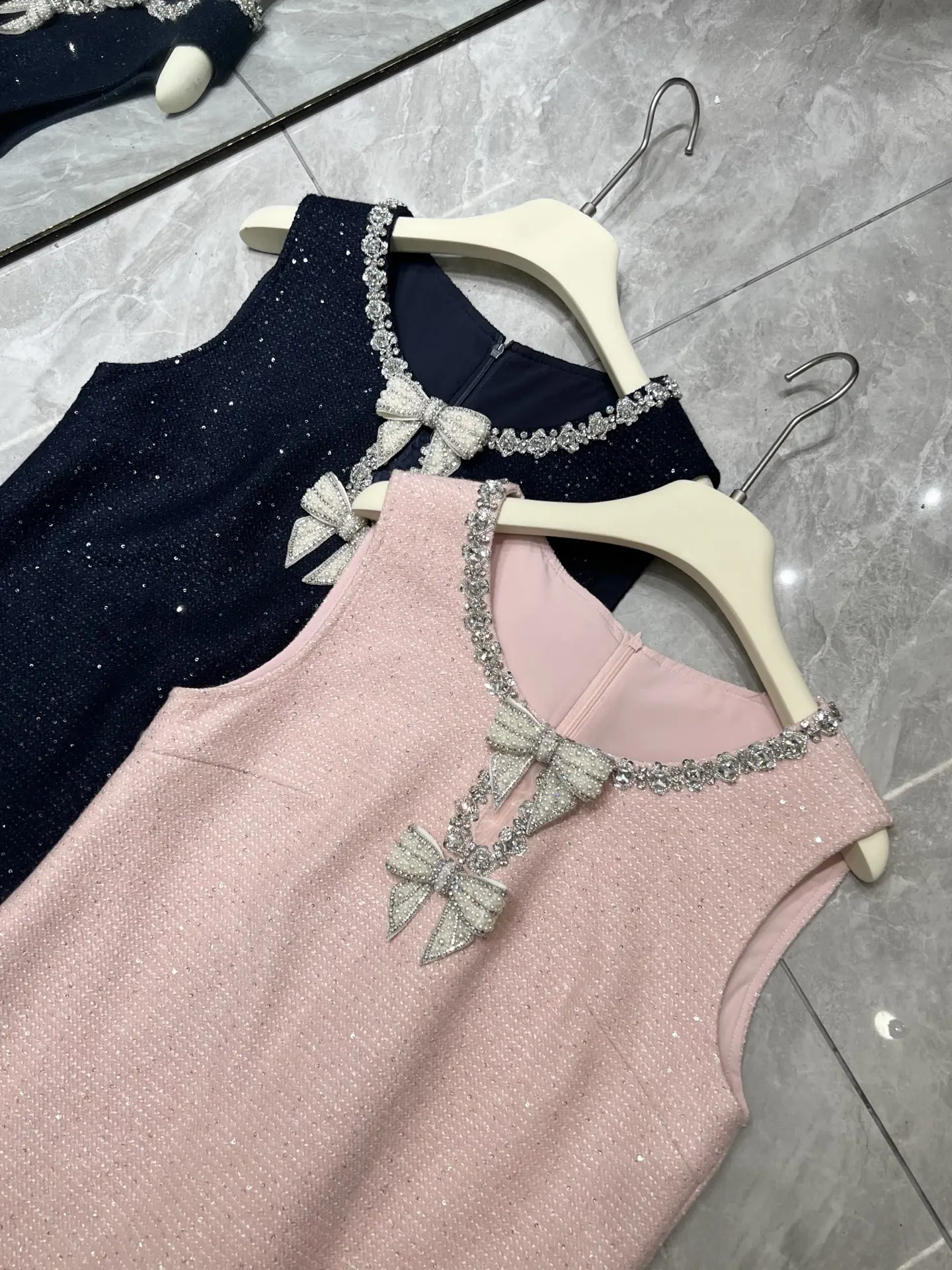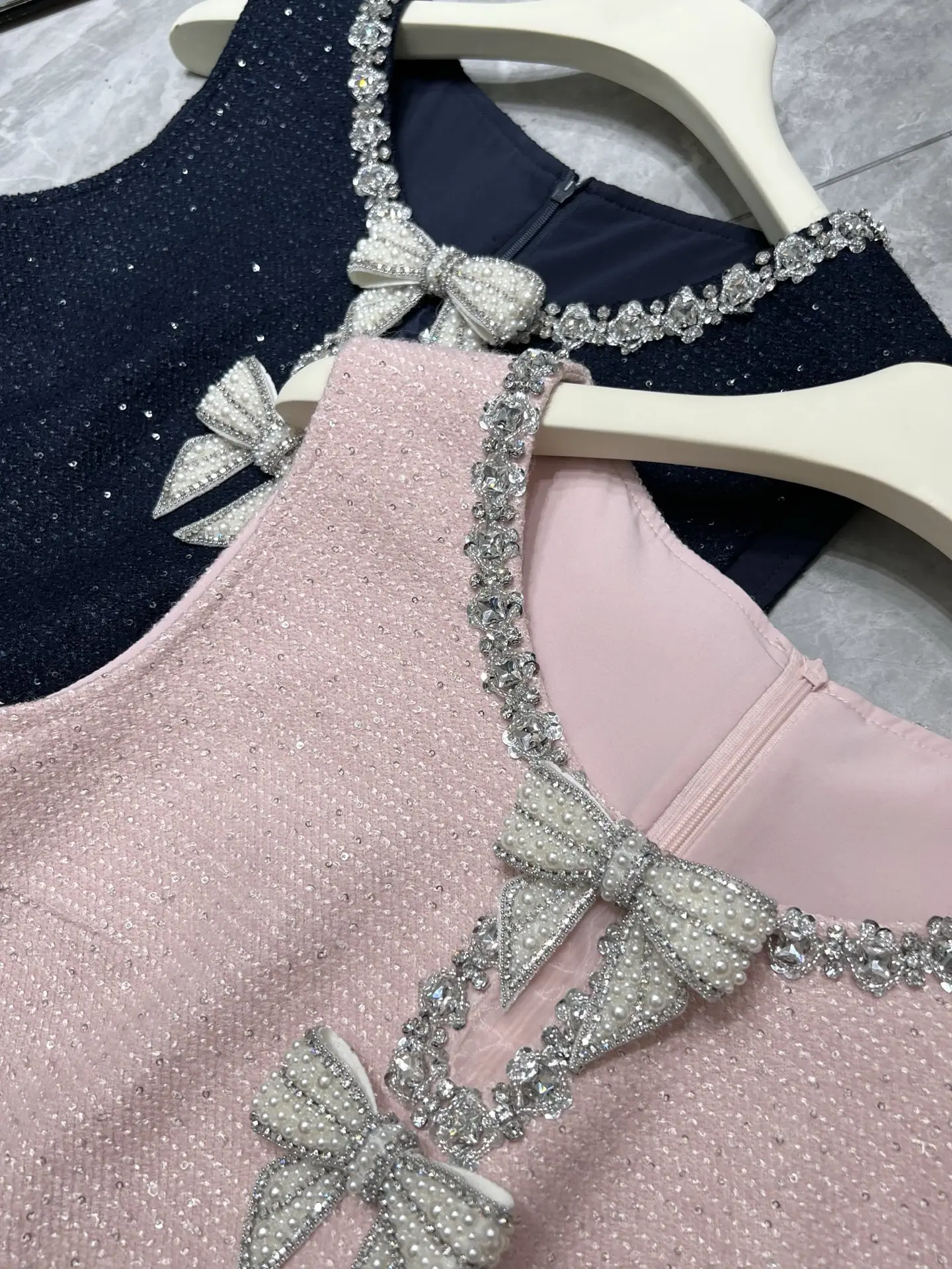 ZJYT Women’s Beading Bowknot Sleeveless Tweed Woolen Dress Autumn New 2025 Fashion Tank Casual Party Dresses Pink Female Clothes