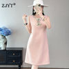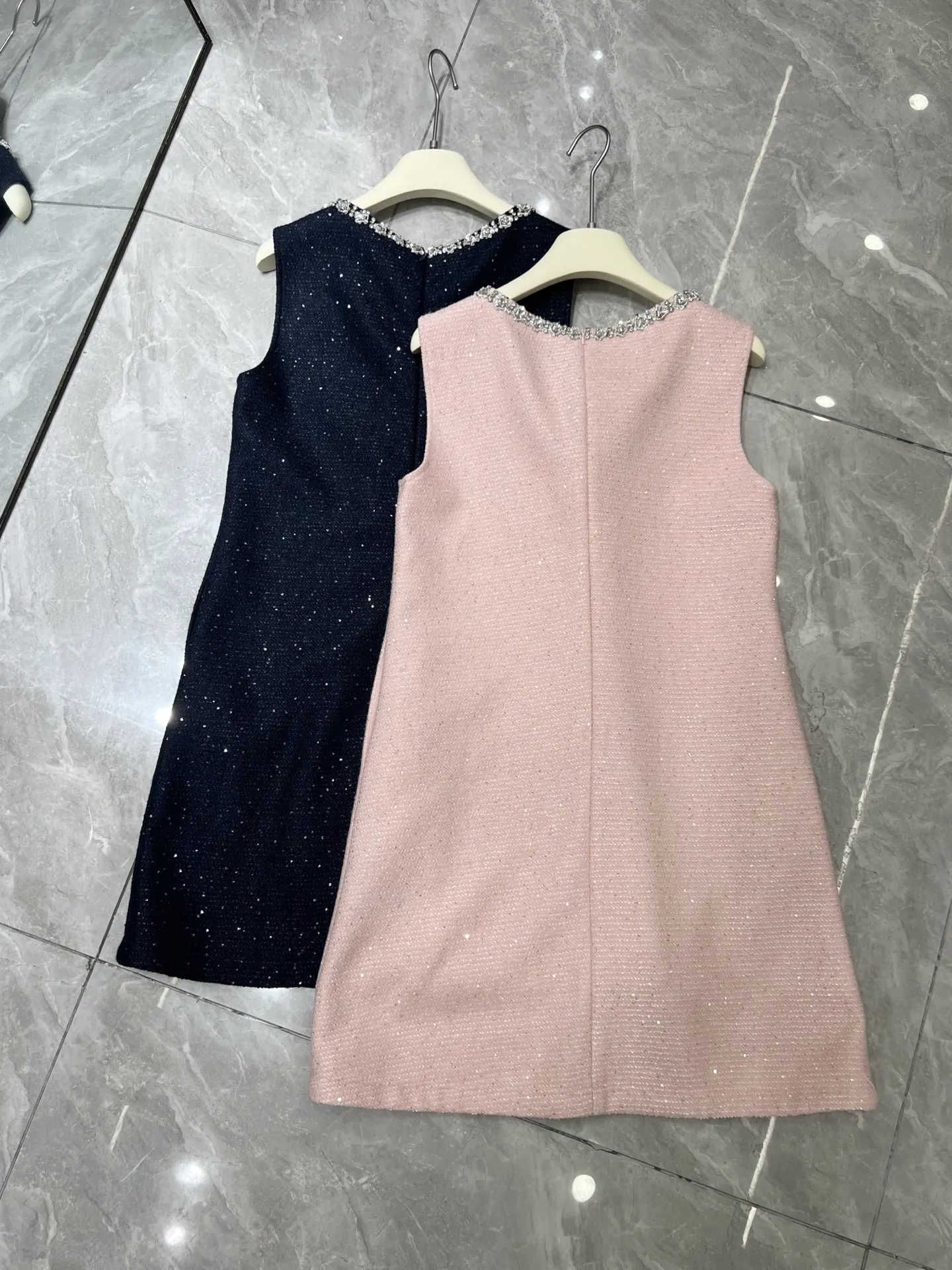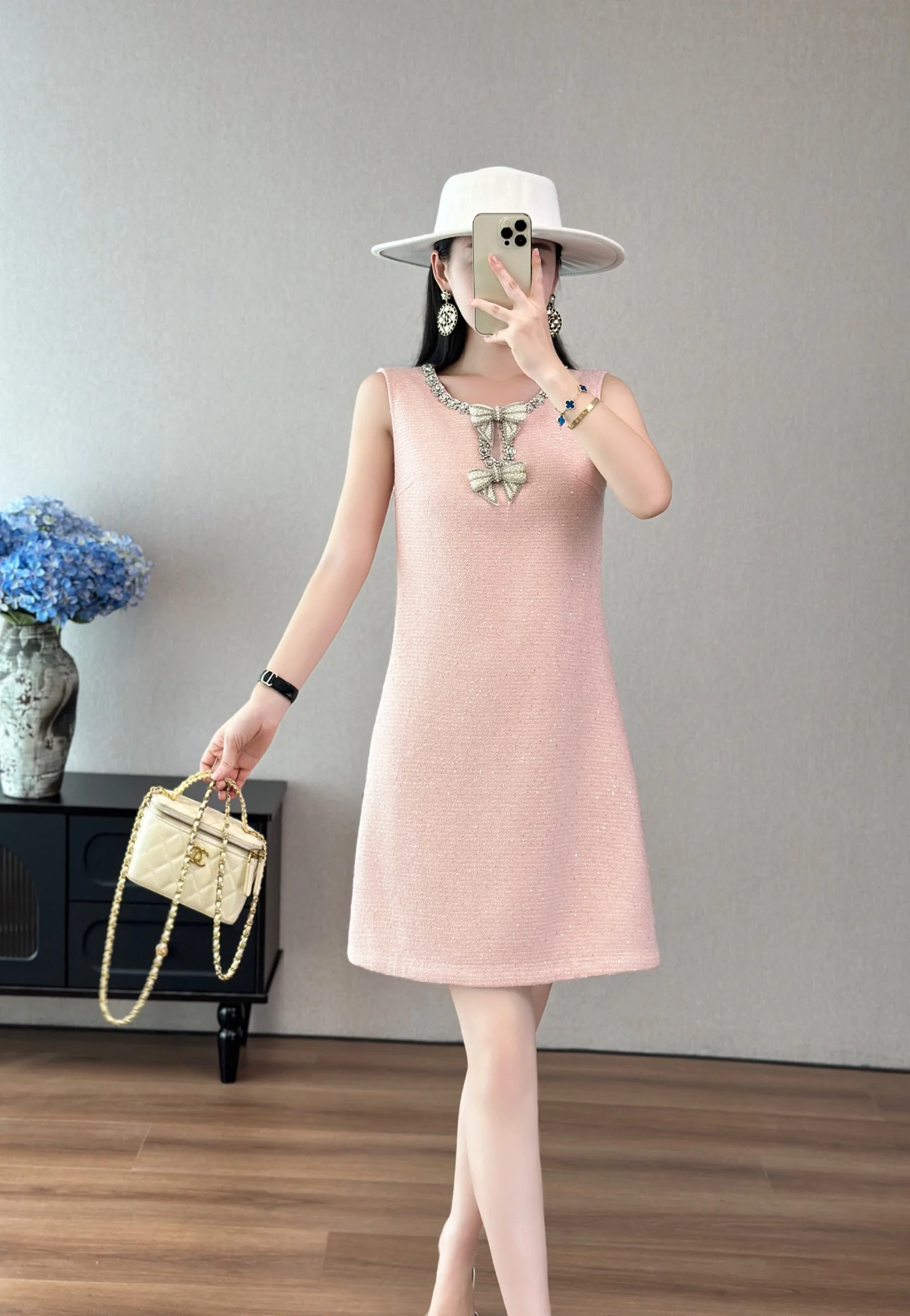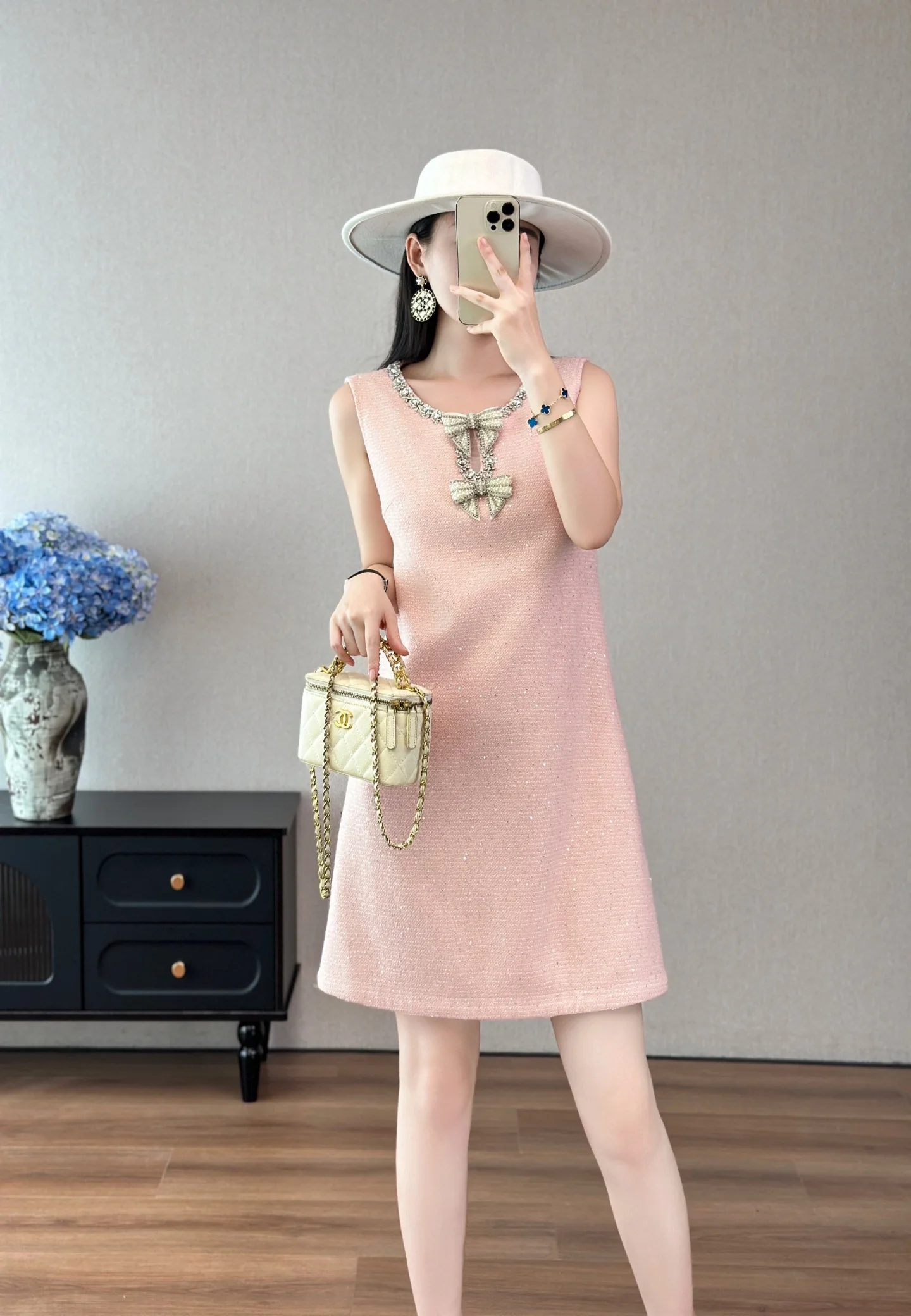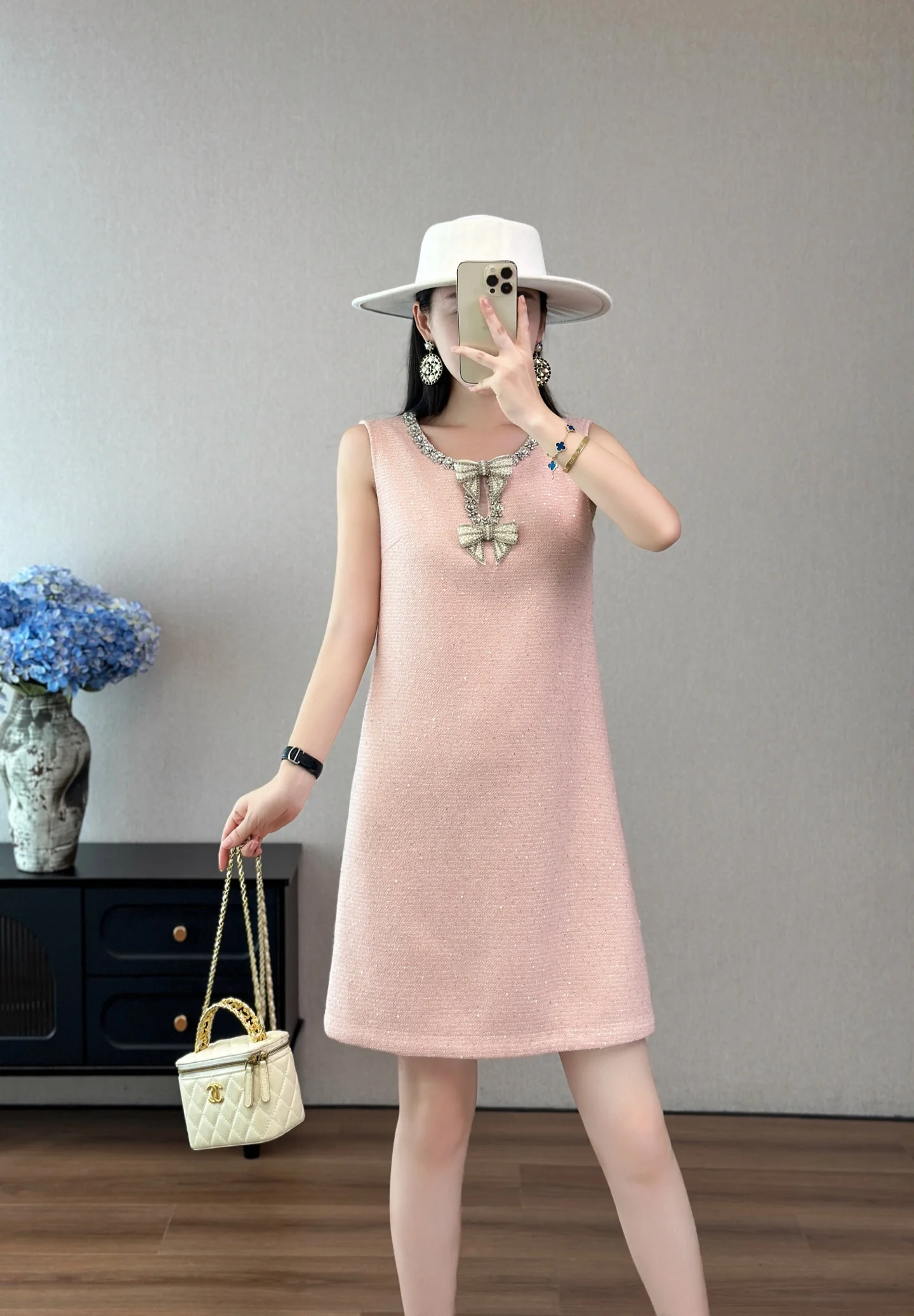 ZJYT Women’s Beading Bowknot Sleeveless Tweed Woolen Dress Autumn New 2025 Fashion Tank Casual Party Dresses Pink Female Clothes