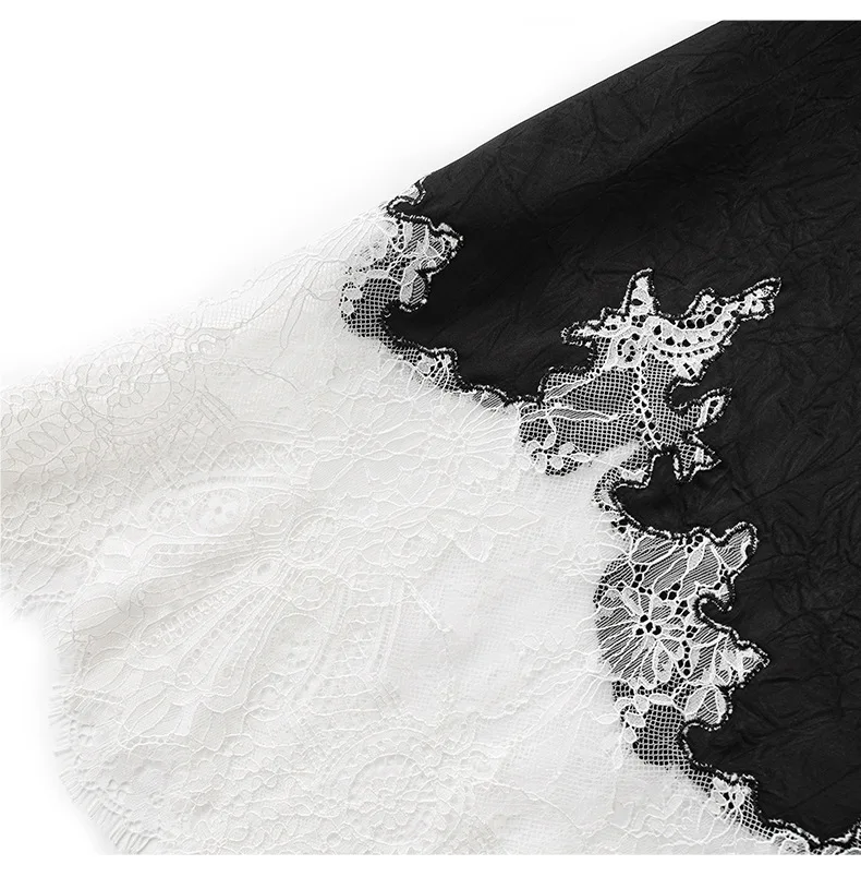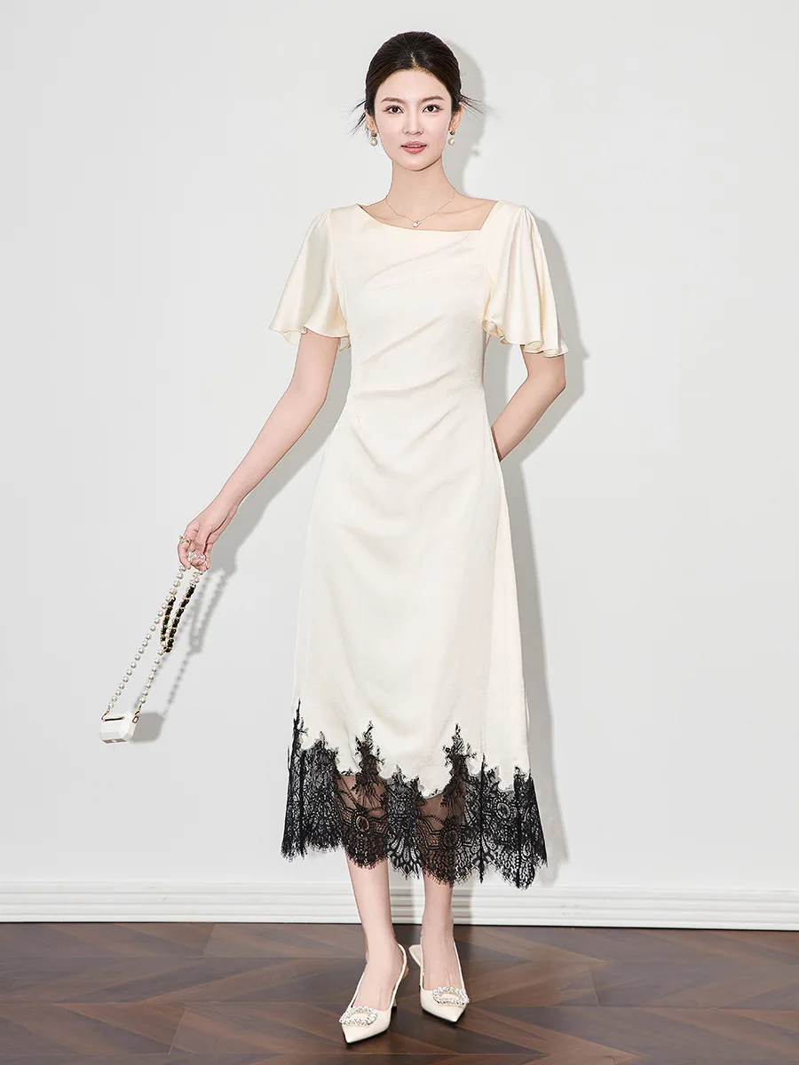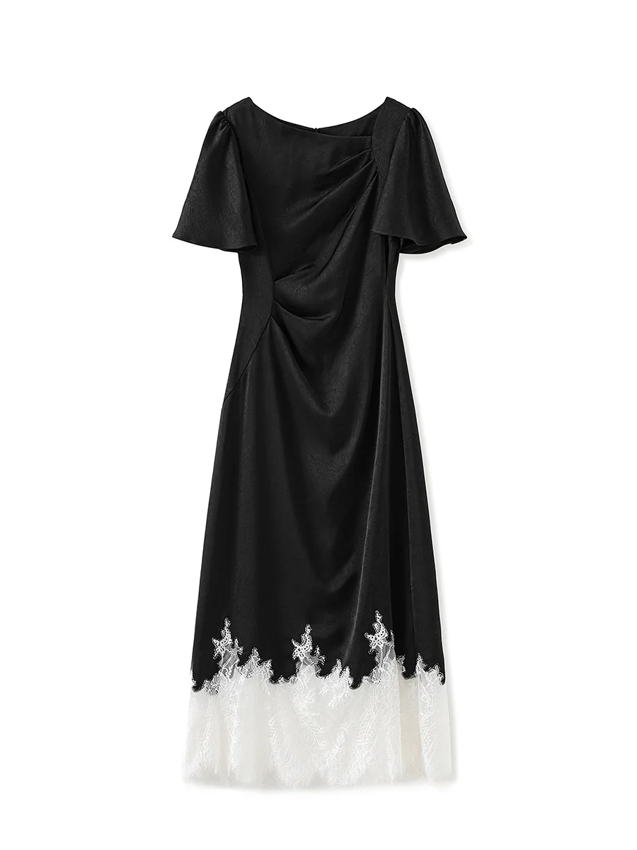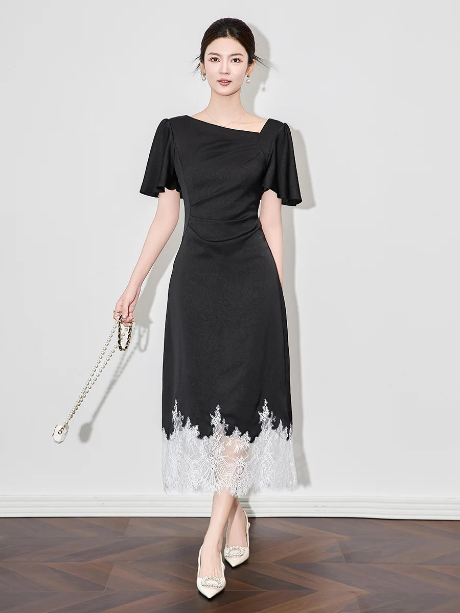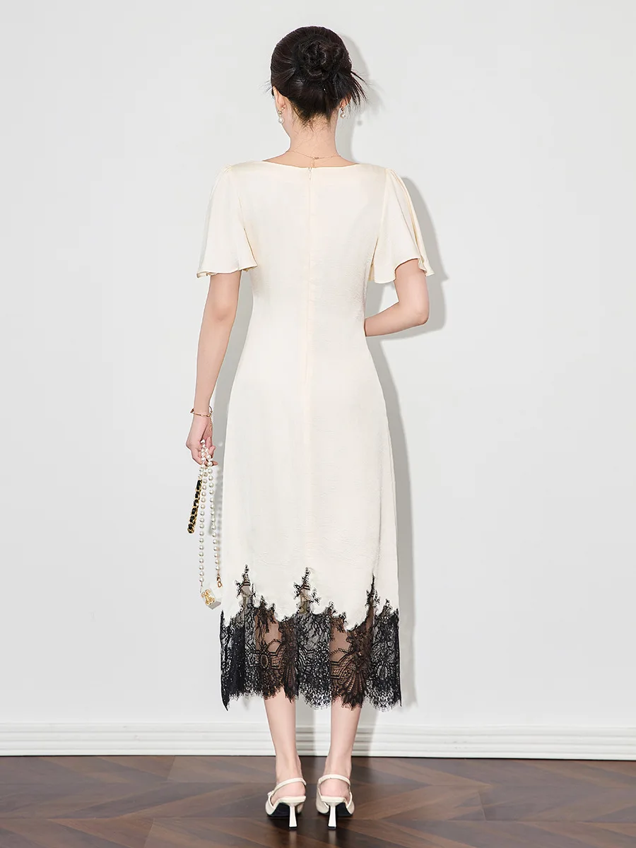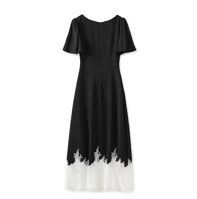 ZJYT Women’s Summer Fashion Dress Elegant Short Sleeve Lace Patchwork White Black Midi Office Lady Dresses Female Clothing 2025